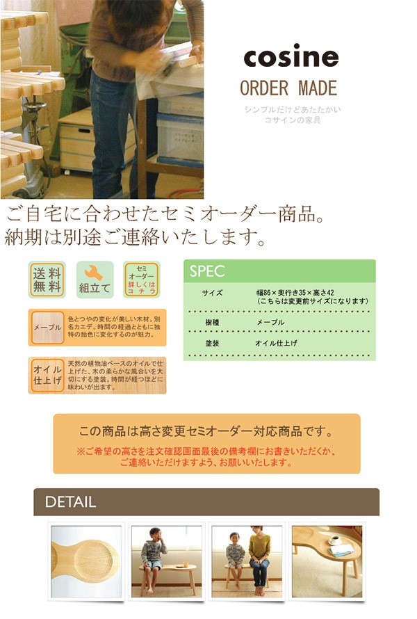 ご希望の高さを注文確認画面最後の備考欄にお書きいただくか、ご連絡いただけますよう、お願いいたします。