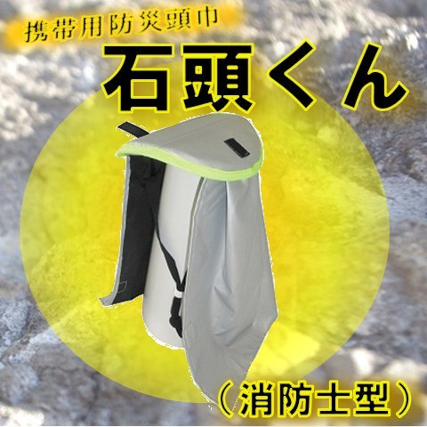 入学準備に最適! 携帯用防災頭巾 石頭くん 消防士型 折り畳んだときは手のひらサイズ たった115g! 広げると頭から肩までカバー。防炎素材。頭頂部内側のポケットにはあらかじめ着脱可能な難燃フェルトを入れて大事な頭を守ります。 フリーサイズなので子供用~大人用まで。 もちろん財布や本も収納可能 《防炎素材使用》財団法人日本防炎協会認定生地使用 《使用上の注意》 この製品は災害時の使用を目的として作られています。雨具の代わり、遊具として等本来の目的以外でのご使用は絶対におやめ下さい。