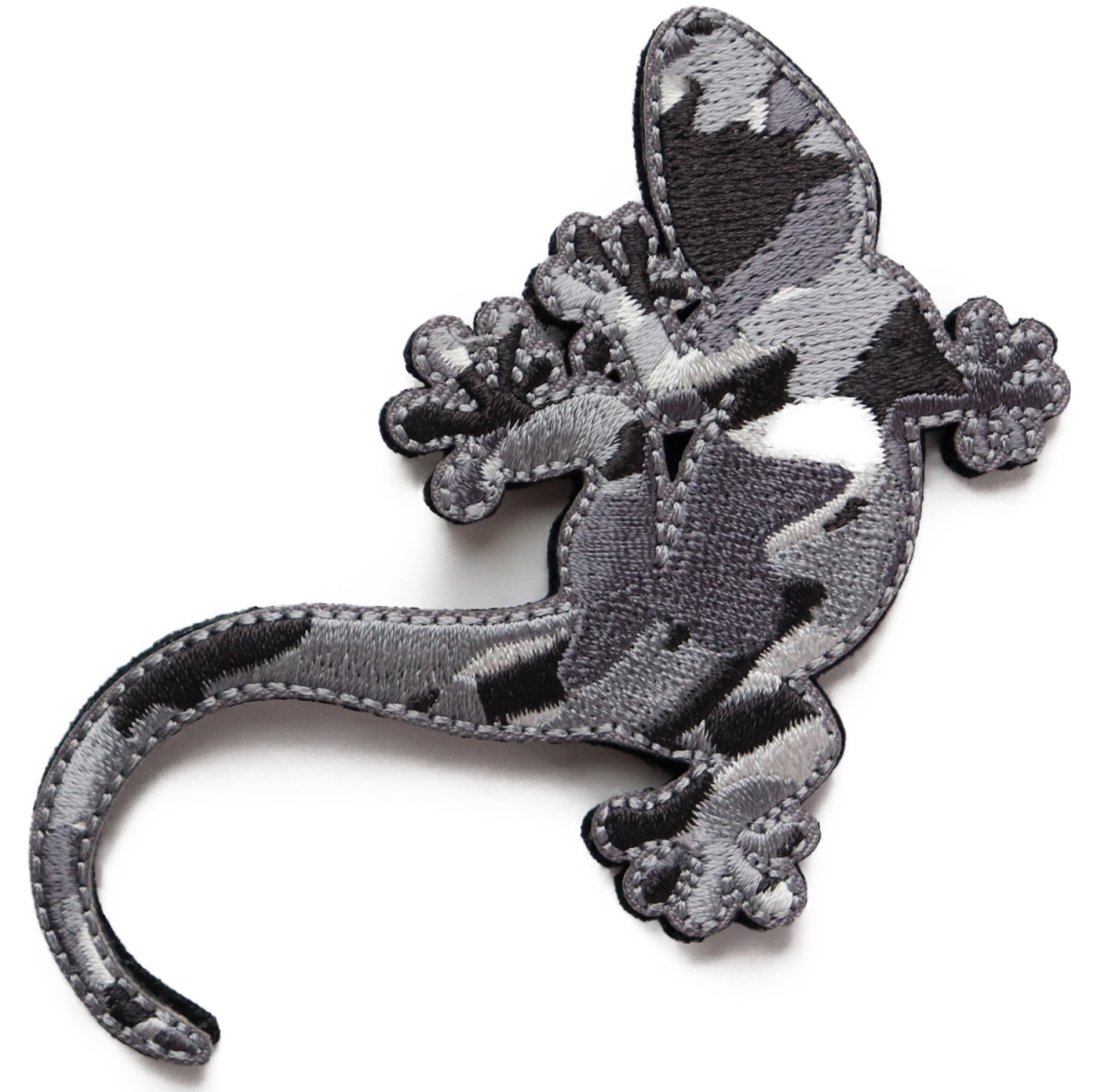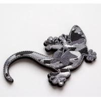 トカゲ(ヤモリ)を迷彩柄(グレー系)でデザインした刺繍ワッペンです。
