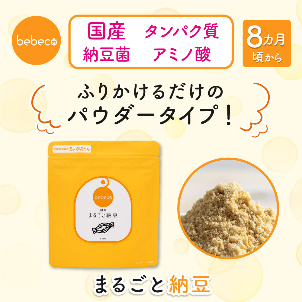 | 特徴 | ・乾燥粉末化により、苦手な人の多い納豆の臭いを軽減。 ・フリーズドライ製法のため、生きた納豆菌を摂取できます。 (※1袋60gあたり生きてる納豆菌5,580億個含有) ・混ぜたり割ったり(つぶしたり)する手間がなく、いつもの離乳食や料理に混ぜたりにふりかけたりするだけ。 ・乾燥粉末化しているため、常温での長期保存が可能。(製造より約1年) |