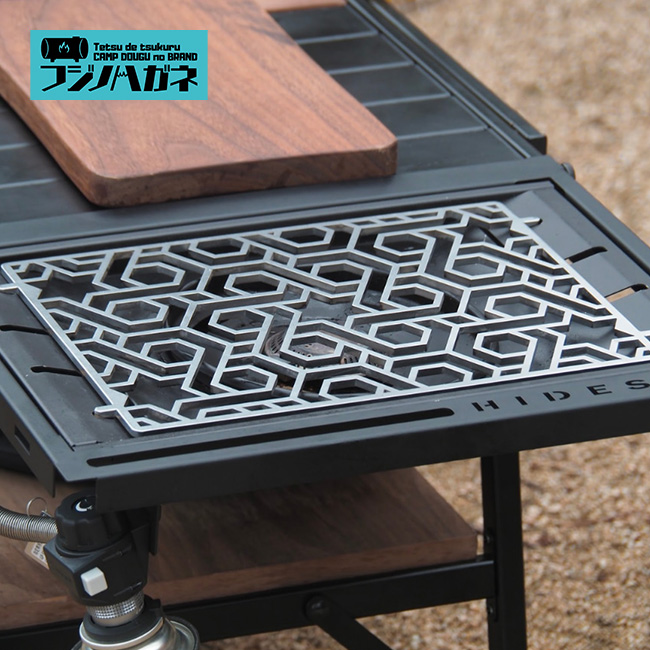 フジノハガネの代表的な五徳『六花』。雪の結晶をモチーフにした六花模様をあしらった、スノーピーク社製フラットバーナー専用の五徳です。