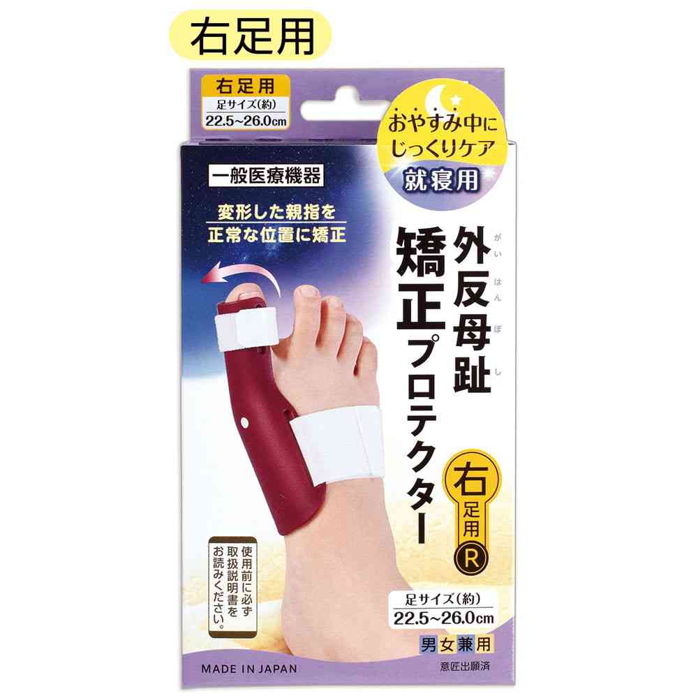 商品説明就寝中に外反母趾により変形した親指を正常な位置に矯正して治療を補助する一般医療機器(右足用)です。足指形状に合わせた本体を親指外側にベルトで固定して、曲がった親指を外側に引っ張り矯正します。ベルトは調整可能なので症状に合わせて矯正できます。