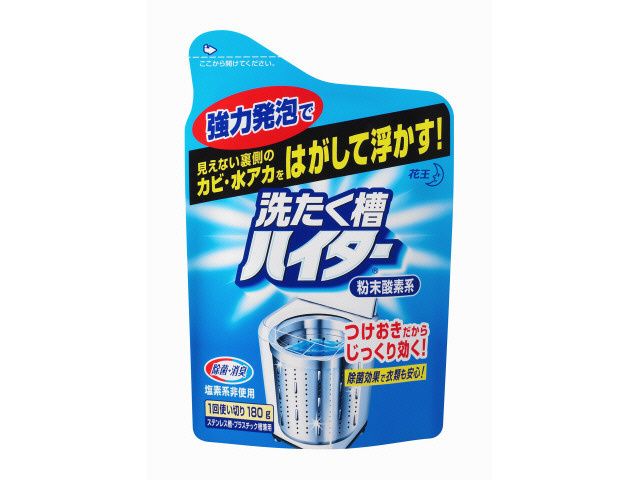 発泡成分が見えない洗たく槽の裏側のカビ・水アカ汚れをはがして浮かせます。除菌もできて、嫌なニオイもスッキリ解消。ツンとしたニオイが気にならない粉末酸素系(つけ置きタイプ)。計量の手間がいらない、1回使い切りタイプです。
