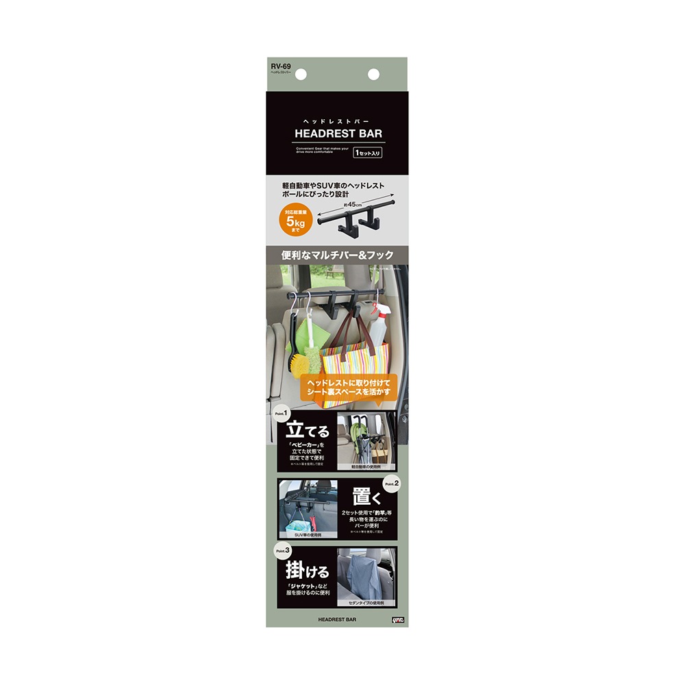 商品説明●ヘッドレストに取り付けていろいろな使い方ができる便利なマルチバー&フック。●マルチバー&フックの1セット入り。●ヘッドレストポールに簡単装着。●マルチバーにハンガー等をそのまま掛けたり、フックにバッグ等を引っ掛けて使用する。●2セット使用すれば、釣竿等の長いものをのせることができる。●対応総重量:約5kg。