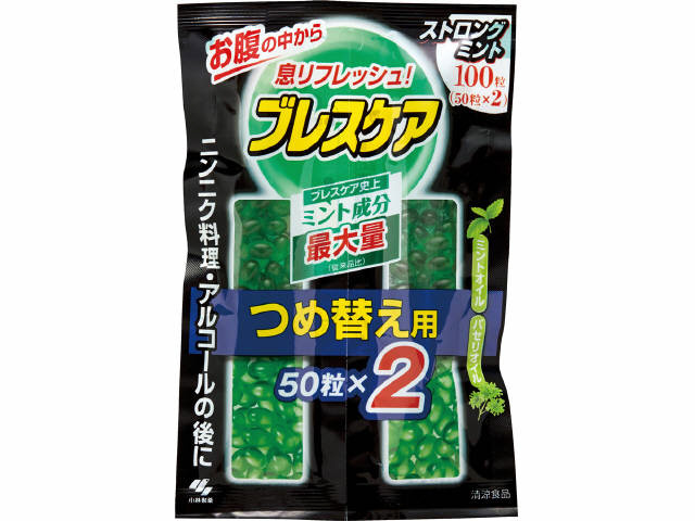 ●ニンニク料理アルコールの後に●お腹の中から息をリフレッシュ●ブレスケアは水で飲む息清涼カプセルです。 ●水で飲むと清涼成分(メントール・パセリオイル)を配合したカプセルがお腹に直接届き、お腹の中から息リフレッシュします。●1日の目安量:2〜3粒、気になるときは3〜4粒●ブレスケア史上ミント成分最大量配合(従来品比)●つめ替え用(50粒×2)