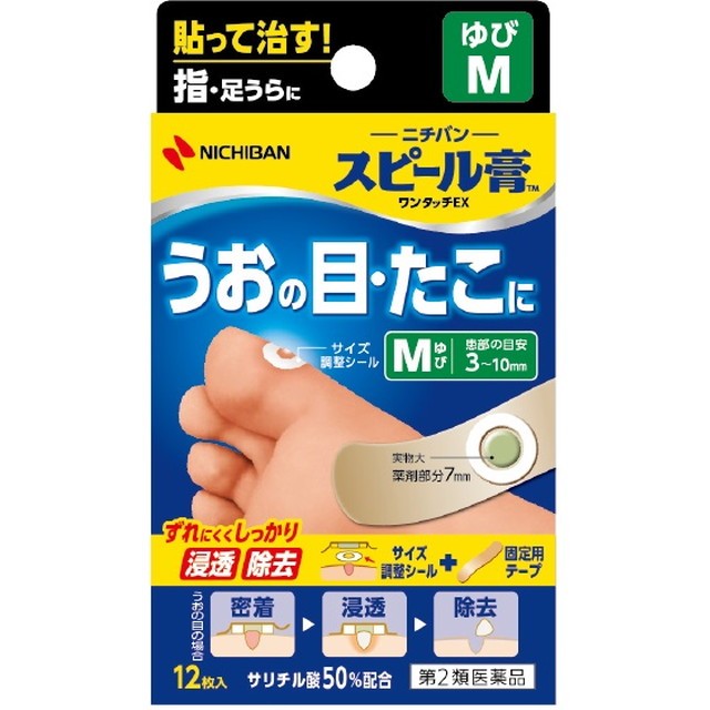 商品説明スピール膏 ワンタッチEXは、サリチル酸の角質軟化溶解作用を利用した角質剥離剤です。厚く硬くなった皮ふをやわらかくし、うおの目、たこ、いぼの角質を取り去ります。また、付属のサイズ調整シールにより、患部にのみ薬剤が付着するように調節できます。●内側の穴の直径:3mm 4.5mm 6mm