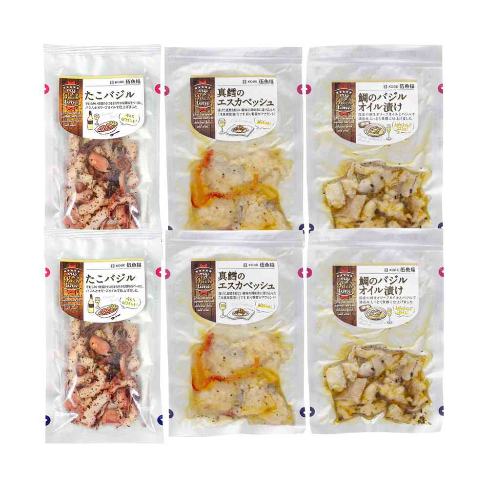 商品説明異なる魅力的な商品をお楽しみいただけます。[冷蔵] 伍魚福 たこバジル 32g×2個/[冷蔵] 伍魚福 真鱈のエスカベッシュ 60g×2個/[冷蔵] 伍魚福 鯛のバジルオイル漬け 45g×2個/を詰め合わせております。