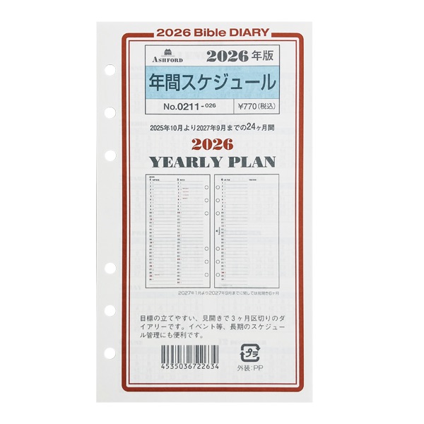 2026年度 ASHFORD BIBLE ダイアリーリフィル 0211-026 年間スケジュール バイブル