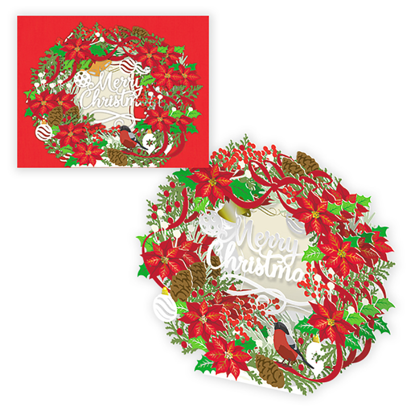 レーザーカットでポインセチアのリースが表現されている立体カードです。