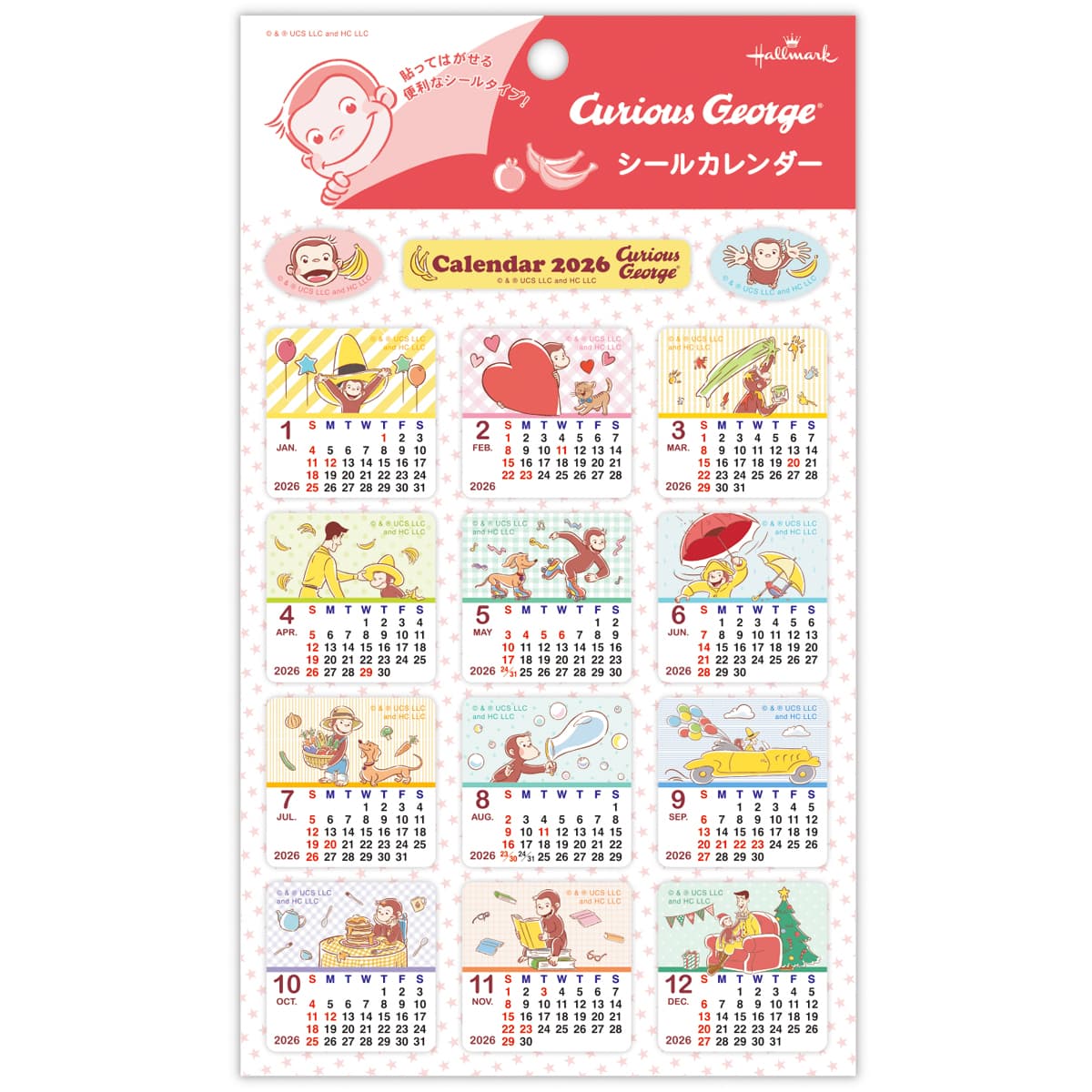 2026年度カレンダー シールカレンダー スクエア おさるのジョージ 845650 日本ホールマーク キャラクター 令和8年 日曜始まり ステッカー キャラクター かわいい