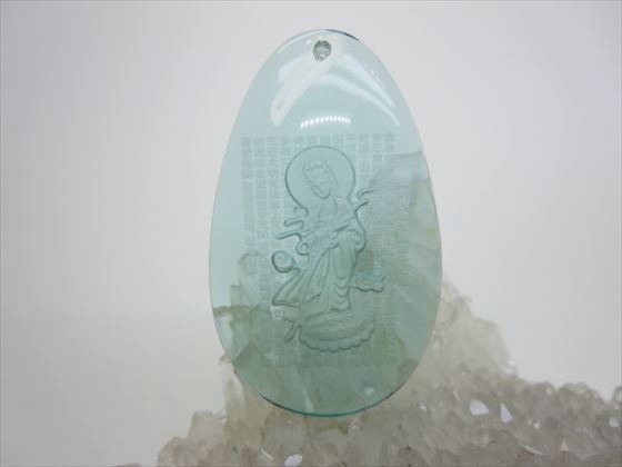 ペンダントトップ クリスタルガラス 手彫り観音様 摩詞般若波羅蜜多心経 50×30×7.5mm ブルーグリーン