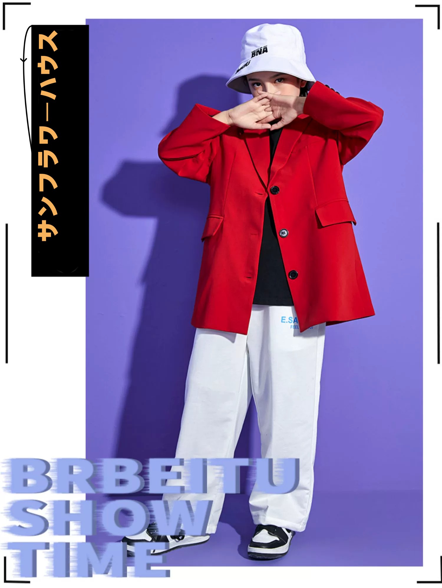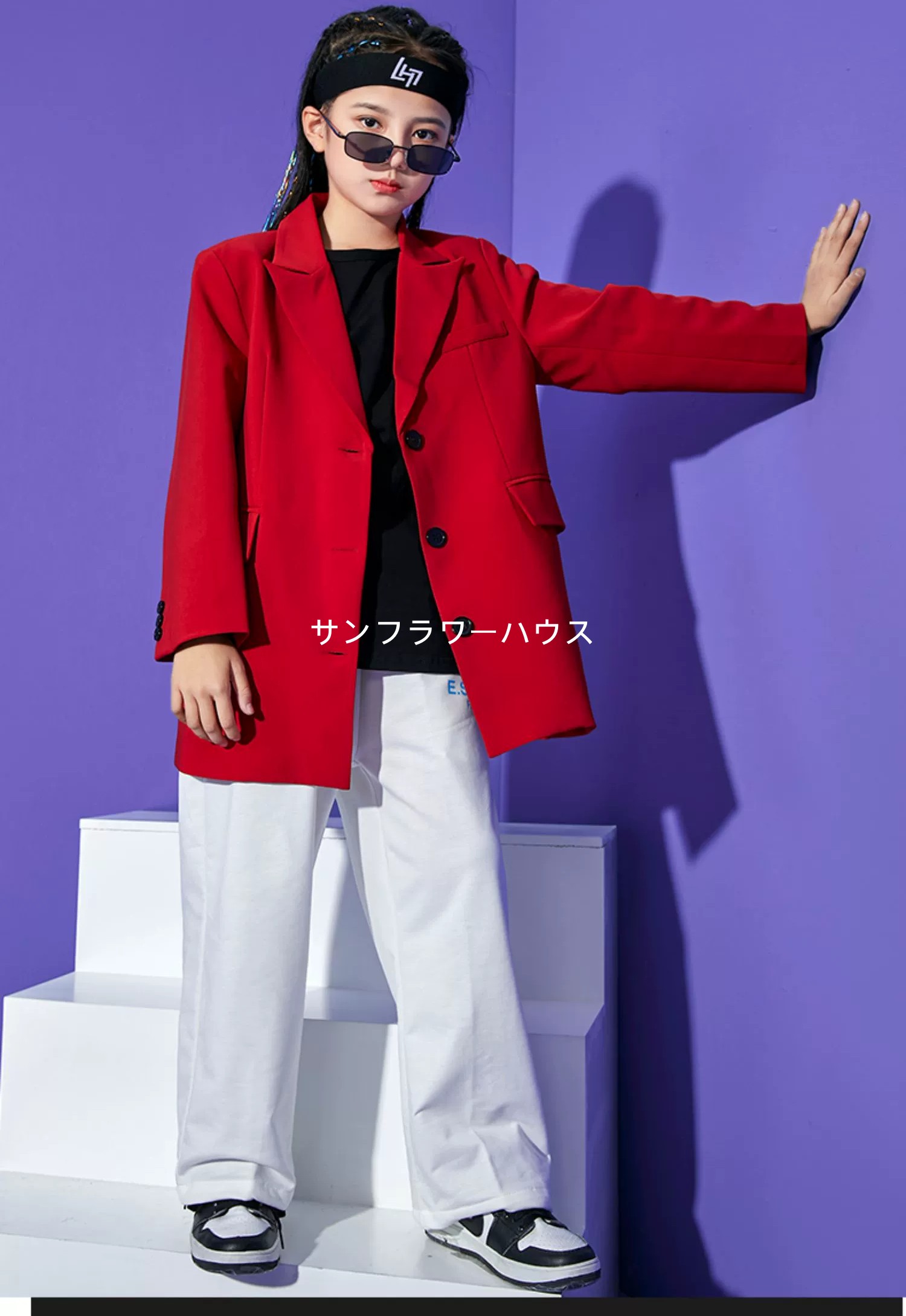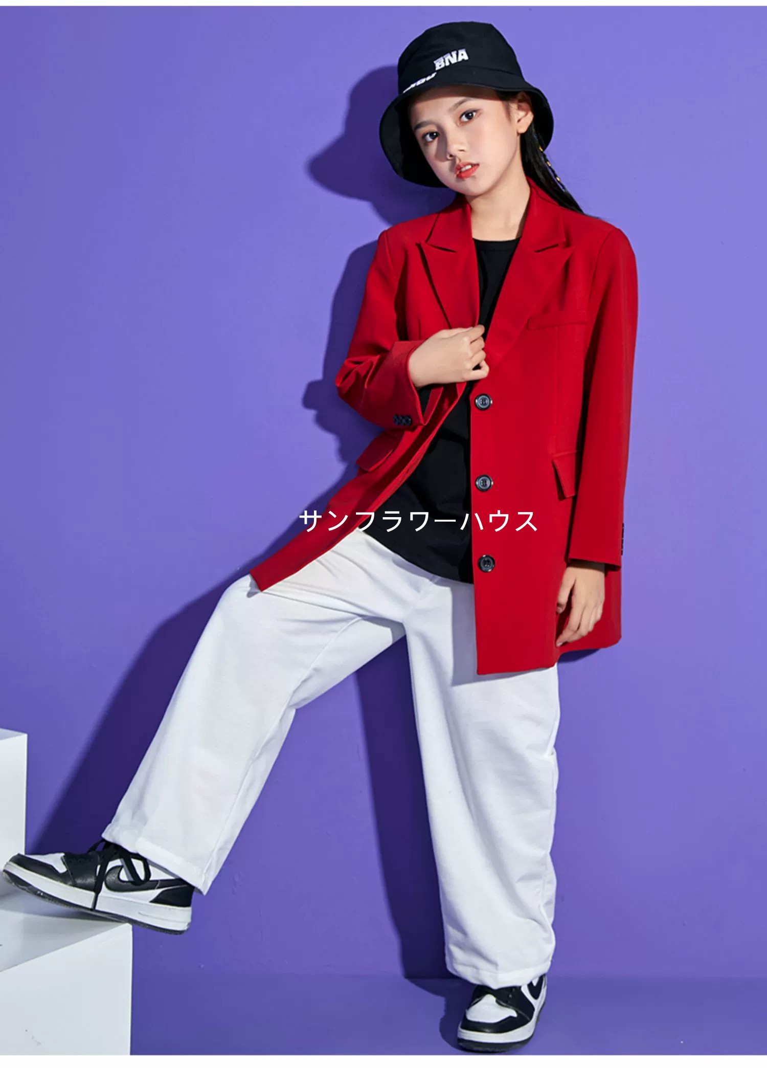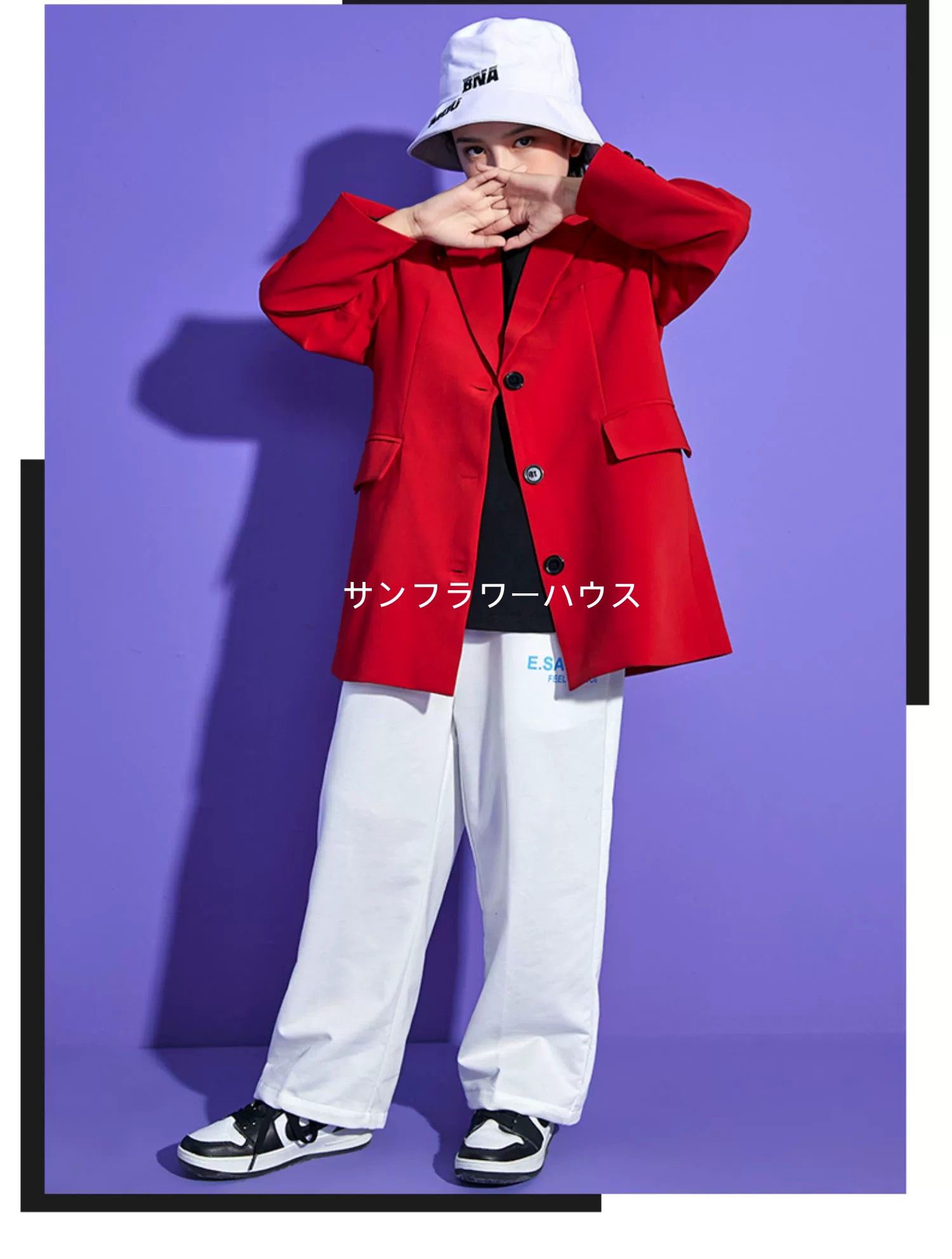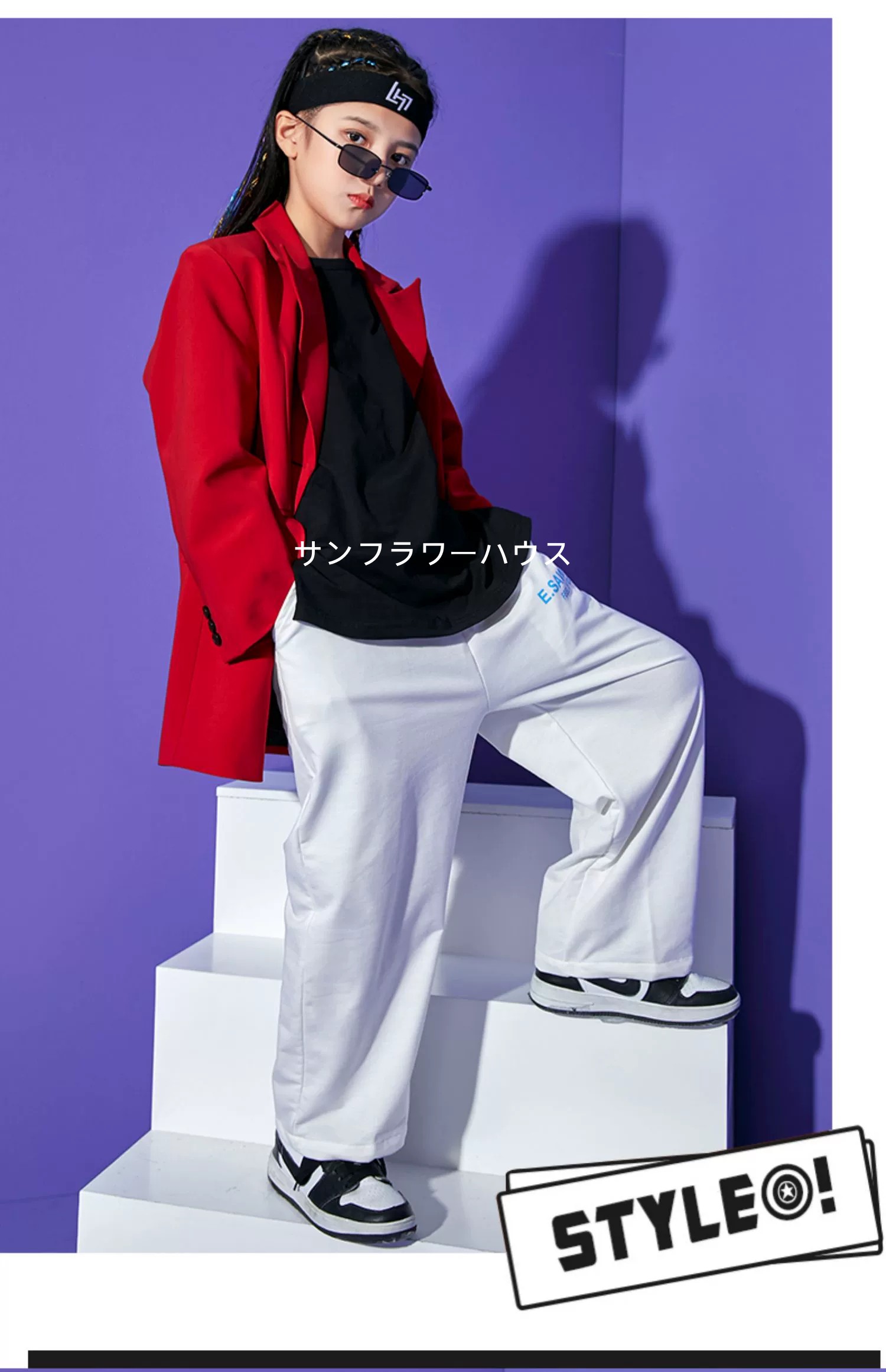 キッズダンス衣装 レッドスーツジャケット ホワイトパンツ ブラックトップス 派手 子供服 ダンス衣装 練習服 演出服 男女兼用 ヒップホップ