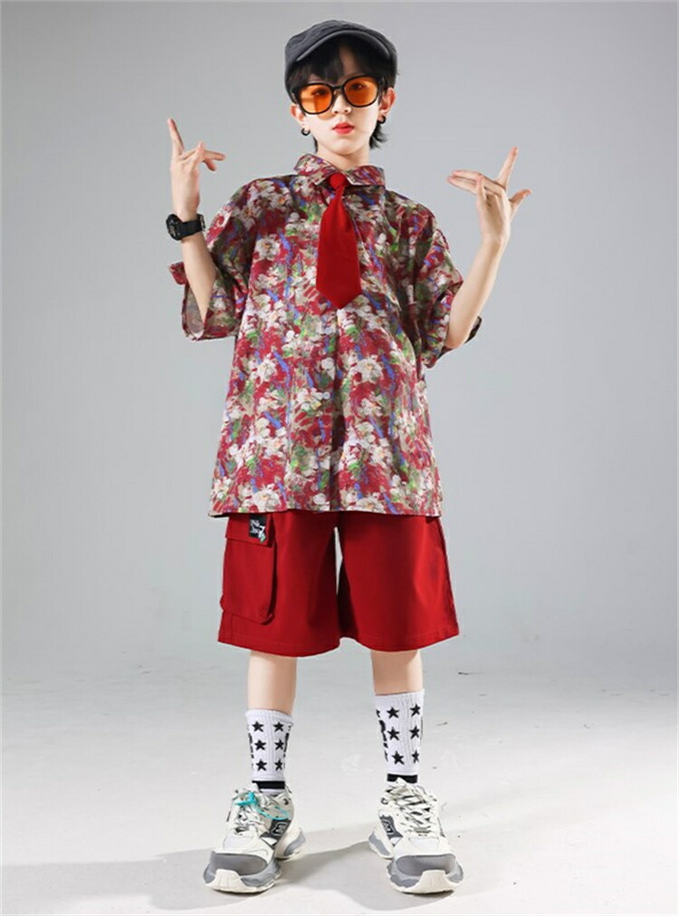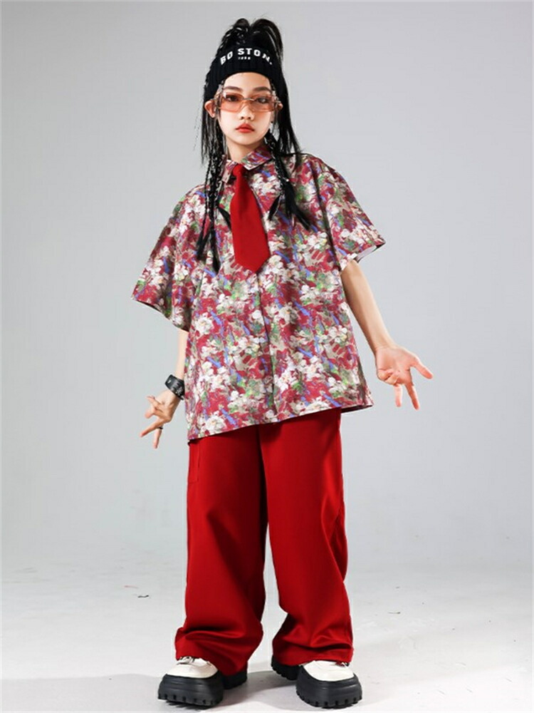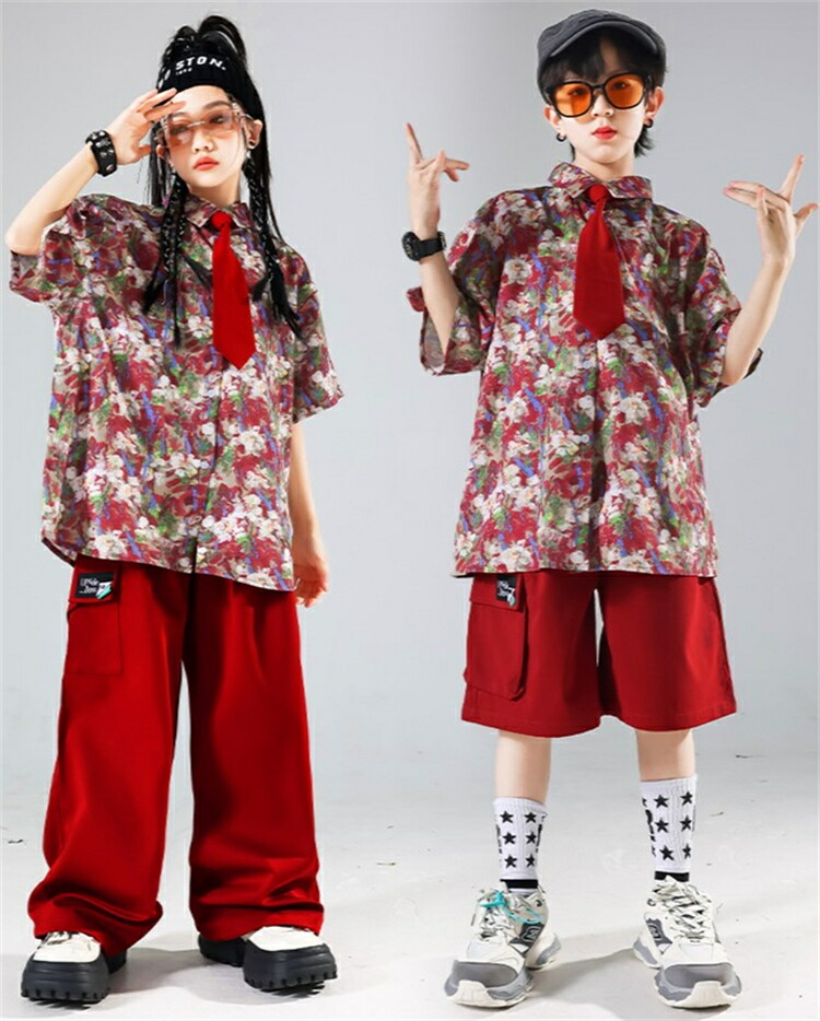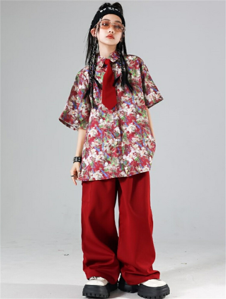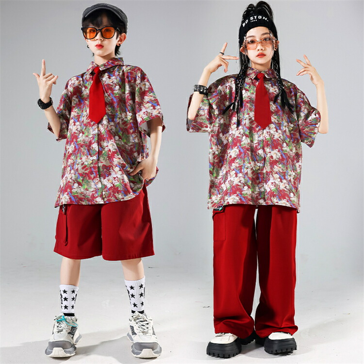 チアダンス ユニセックス ダンス衣装 女の子 男の子 ジャズダンス セットアップ キッズダンス衣装 子供服 k-pop HIPHOP 柄シャツ 赤 レッド 長ズボン明るめの赤