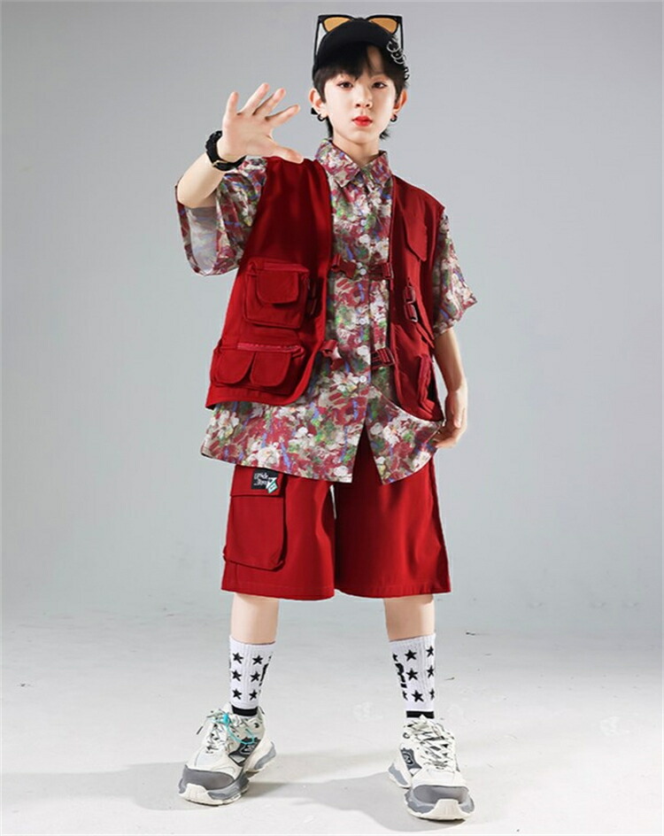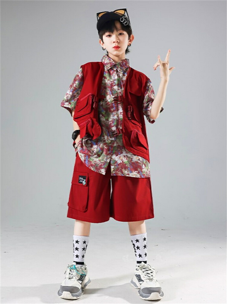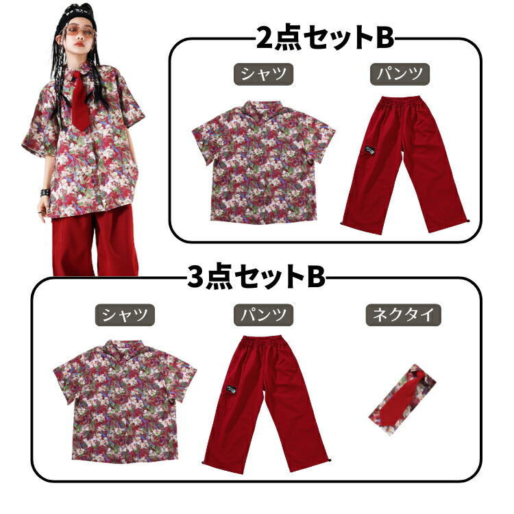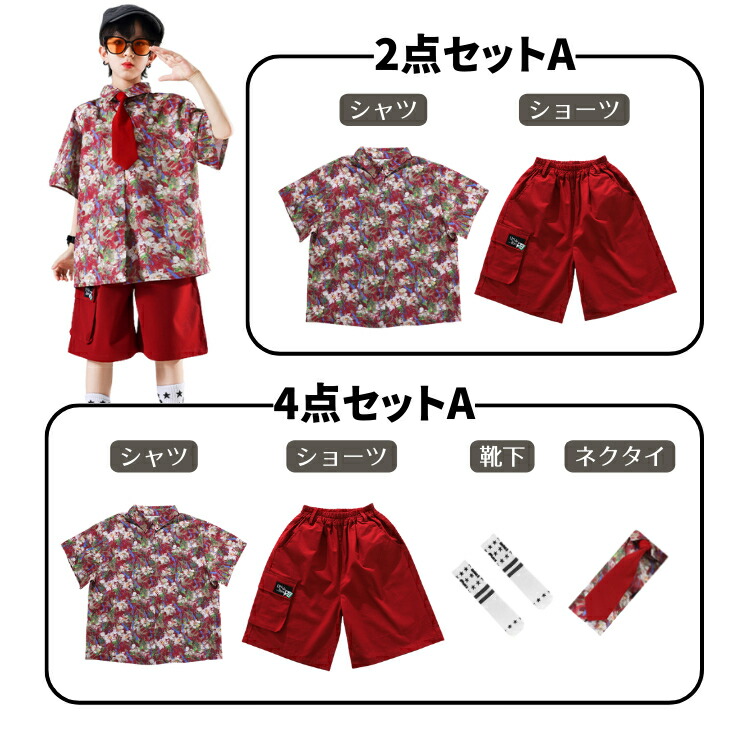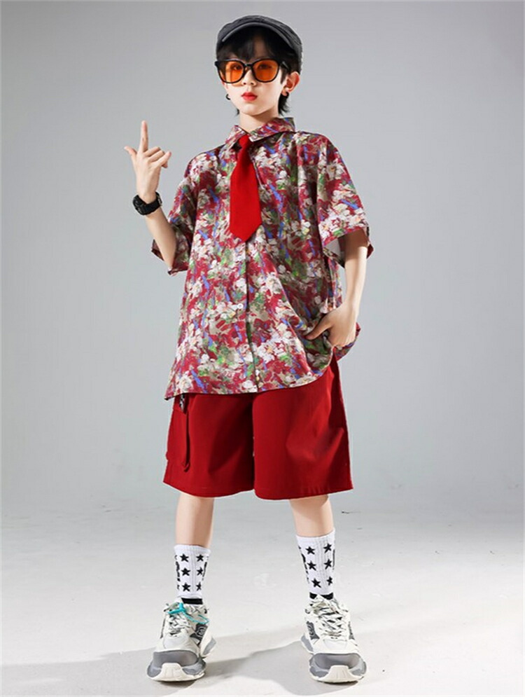 チアダンス ユニセックス ダンス衣装 女の子 男の子 ジャズダンス セットアップ キッズダンス衣装 子供服 k-pop HIPHOP 柄シャツ 赤 レッド 長ズボン明るめの赤