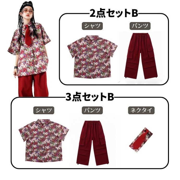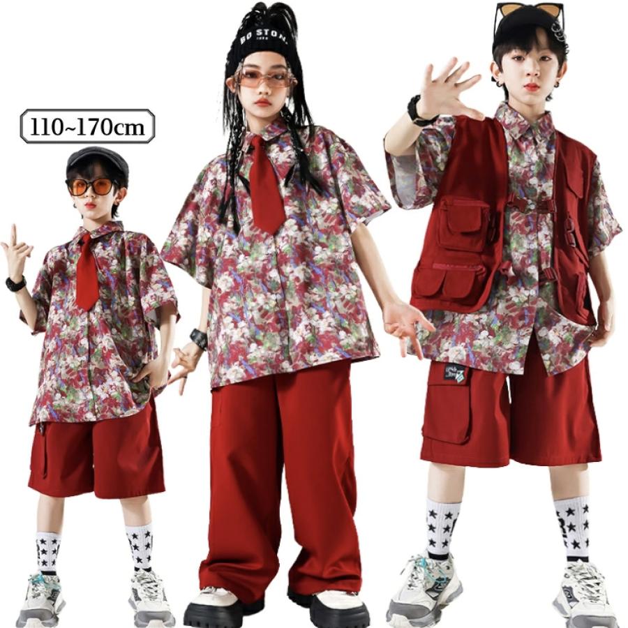チアダンス ユニセックス ダンス衣装 女の子 男の子 ジャズダンス セットアップ キッズダンス衣装 子供服 k-pop HIPHOP 柄シャツ 赤 長ズボン暗めの赤