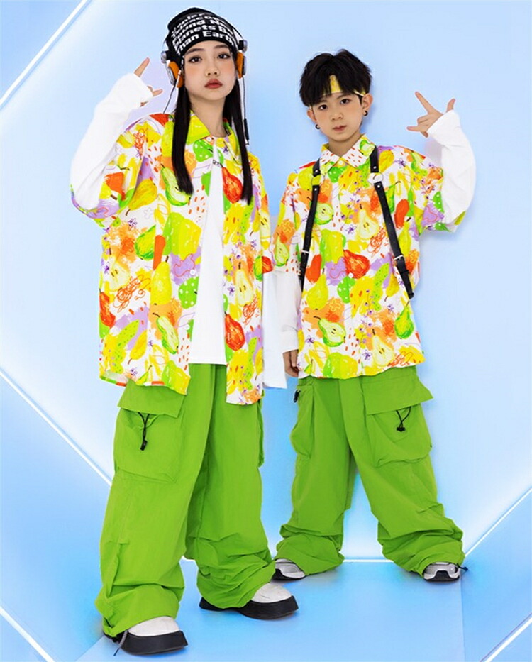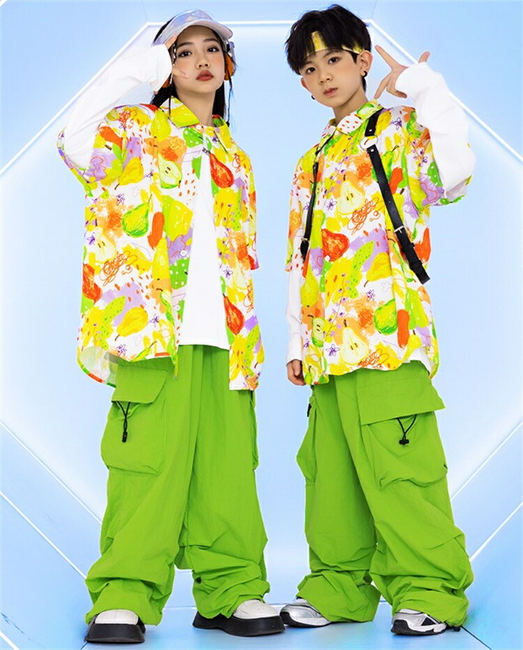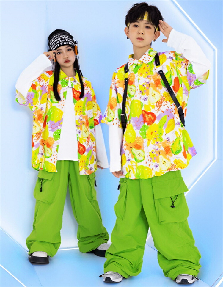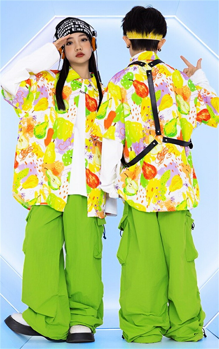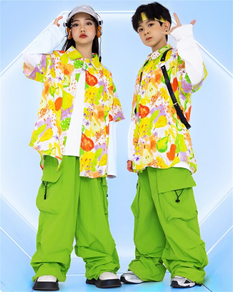 セットアップ キッズダンス衣装 女の子 男の子 子供 長袖 上下 ステージ衣装 ファッション ジャズダンス ヒップホップ チアガール キッズ パンツ 柄シャツ 緑