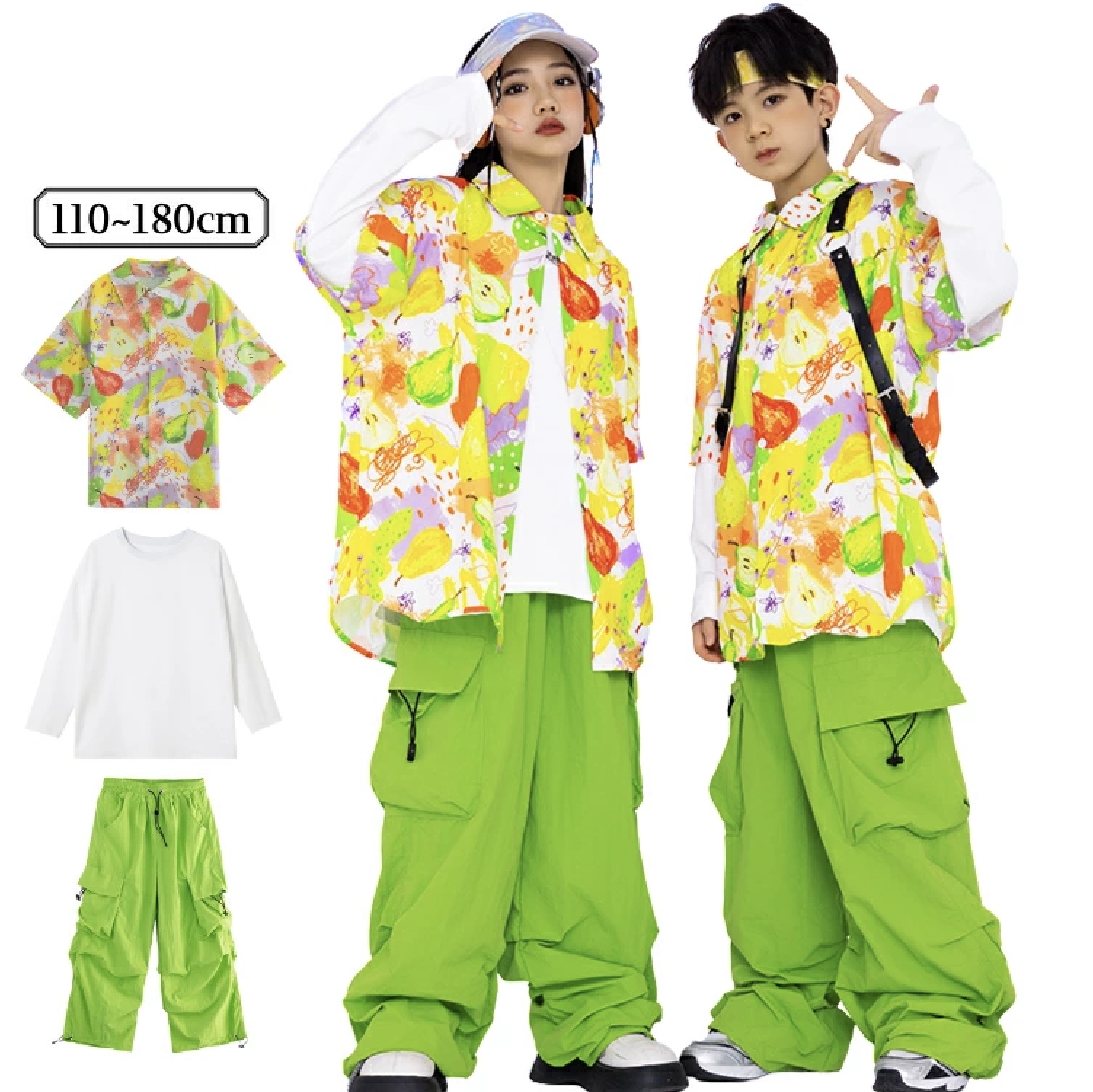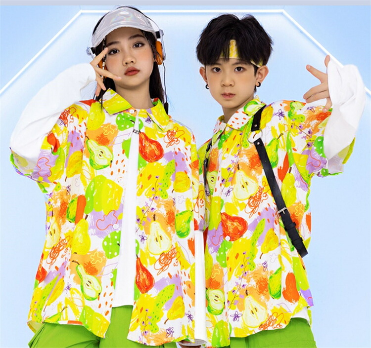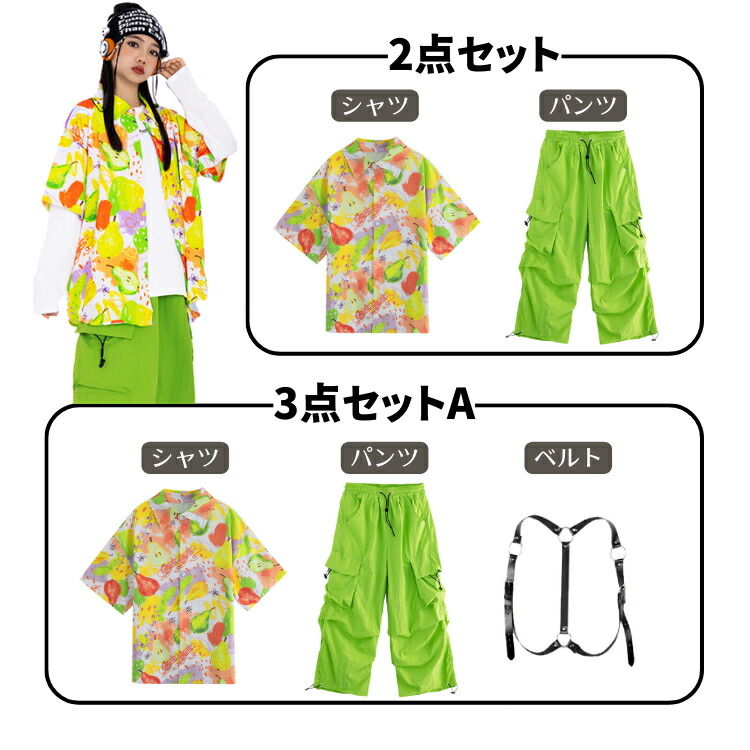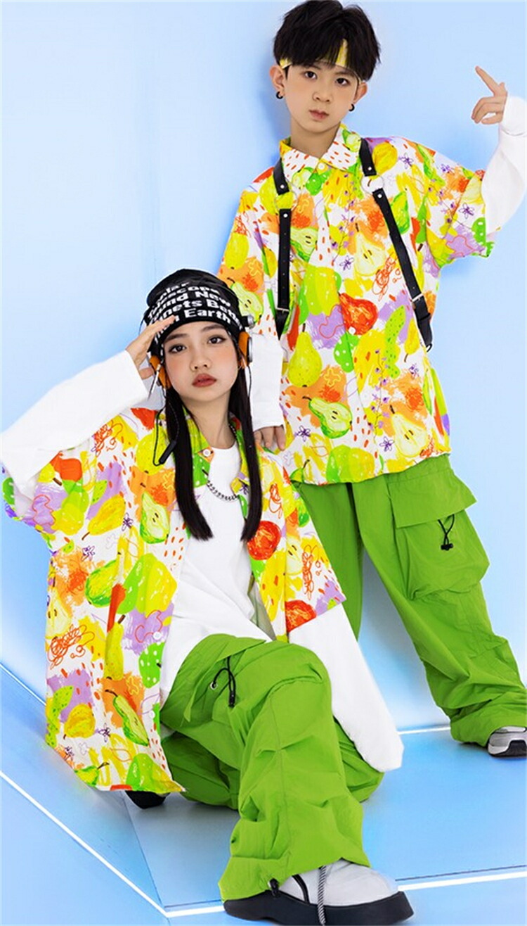 セットアップ キッズダンス衣装 女の子 男の子 子供 長袖 上下 ステージ衣装 ファッション ジャズダンス ヒップホップ チアガール キッズ パンツ 柄シャツ 緑