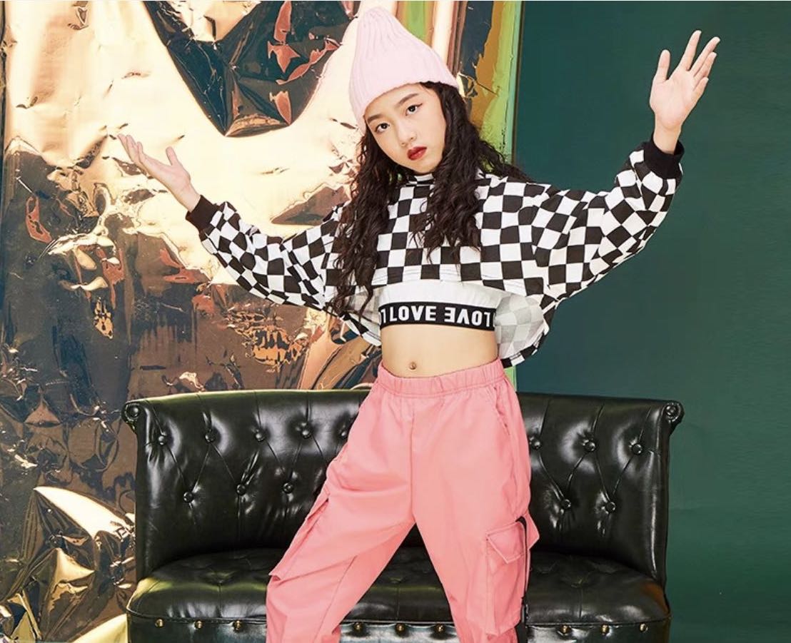 トップス キッズダンス衣装 へそ出しパーカー ヒップホップ HIPHOP 子供 へそ出し ブロック柄 ガールズ かっこいい 派手 練習着 演出服 セール 即納