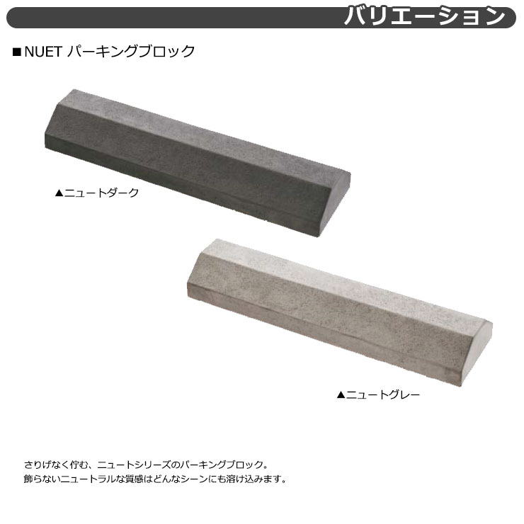 駐車場用品 NEUT Parking ニュートパーキング 2個セット サイズ 本体:W600×D170×H80mm 15.0kg カラー ・ニュートグレー ・ニュートダーク 材質 コンクリート 仕様 パーキングブロック(車止め)2個セット 備考・注意 ※配送には実働約4日〜7日程度お時間が必要となります。お急ぎの方はお問い合わせください。 ※製品特性上表面に小さな気泡がある商品もございます。商品不良ではありませんので予めご了承ください。 ※イメージ画像はイメージサンプルとして販売内容以外の商品があります。必ず内容を確認ください。 ※イメージ画像は使用するブラウザにより色が違って見える場合があります。 ※設置場所は安定感を確保するために下が平坦な場所に設置してください。 ※設置はコンクリート専用ボンドで接着してください。ボンドは別途購入ください。