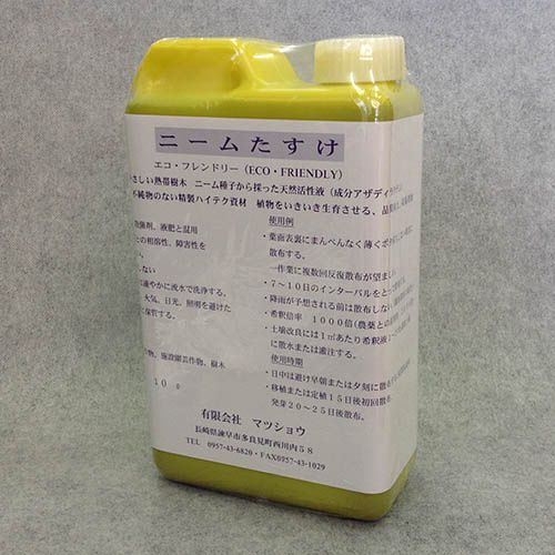 ニームたすけはニーム成分を豊富に含んだ可乳化性濃厚液です。すべて天然物からつくられ、UV(紫外線)安定性、保存安定性があり強いバイオ活性を現す特徴があります。