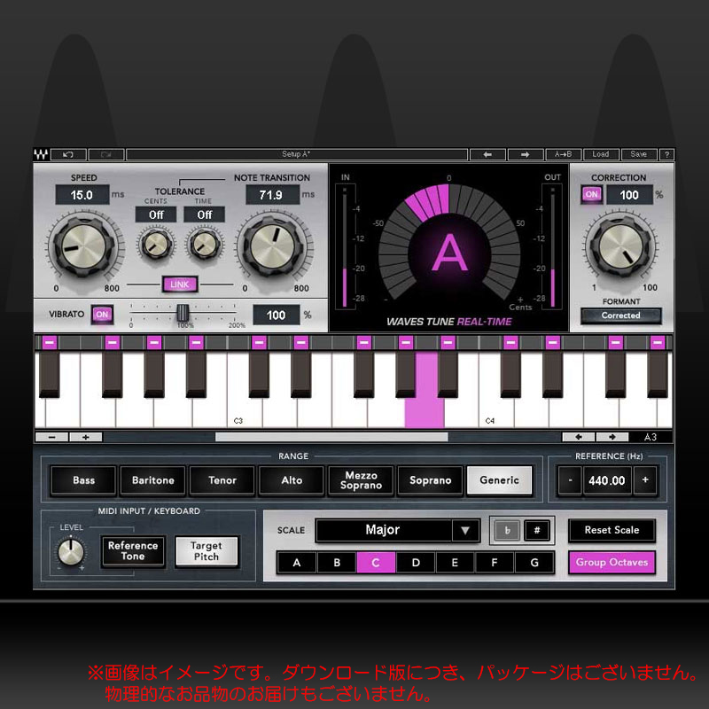 また、Waves Tune Real-Timeは楽曲とボーカリストの歌唱法に合わせてプログラム、カスタマイズが可能です。ノート・レンジ調整、スケール指定、特定ノートの除外または固定、プラグインの感度調整といった機能に加え、ボーカル・ビブラートもオリジナルの自然な動きはそのままにチューニングが可能です。もし楽曲のスケールがはっきりしない場合は、バーチャル・キーボードからノートを入力したり、MIDIキーボードからのメロディ演奏にプラグインを追従させることもできます。