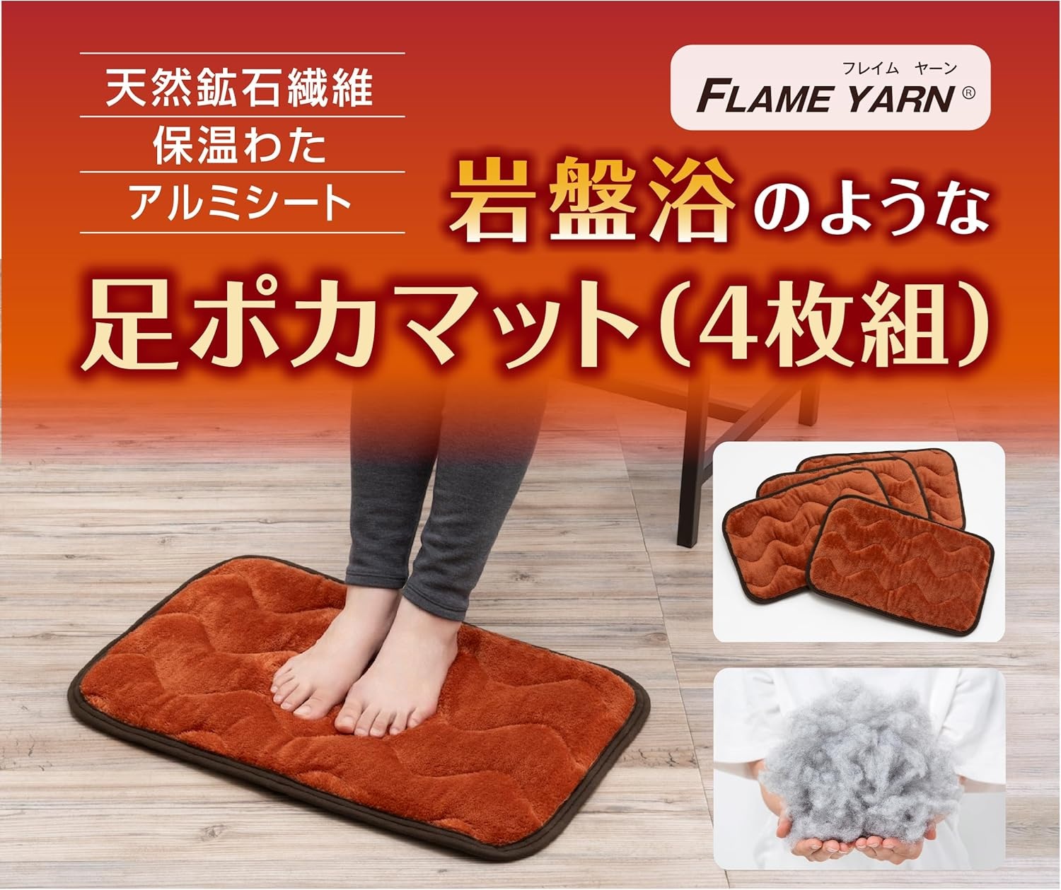 ガマカ工業 FLAME YARN 岩盤浴のような足ポカマット4枚組 岩盤浴 保温 あったか 冬 暖かい ゴロ寝 蓄熱