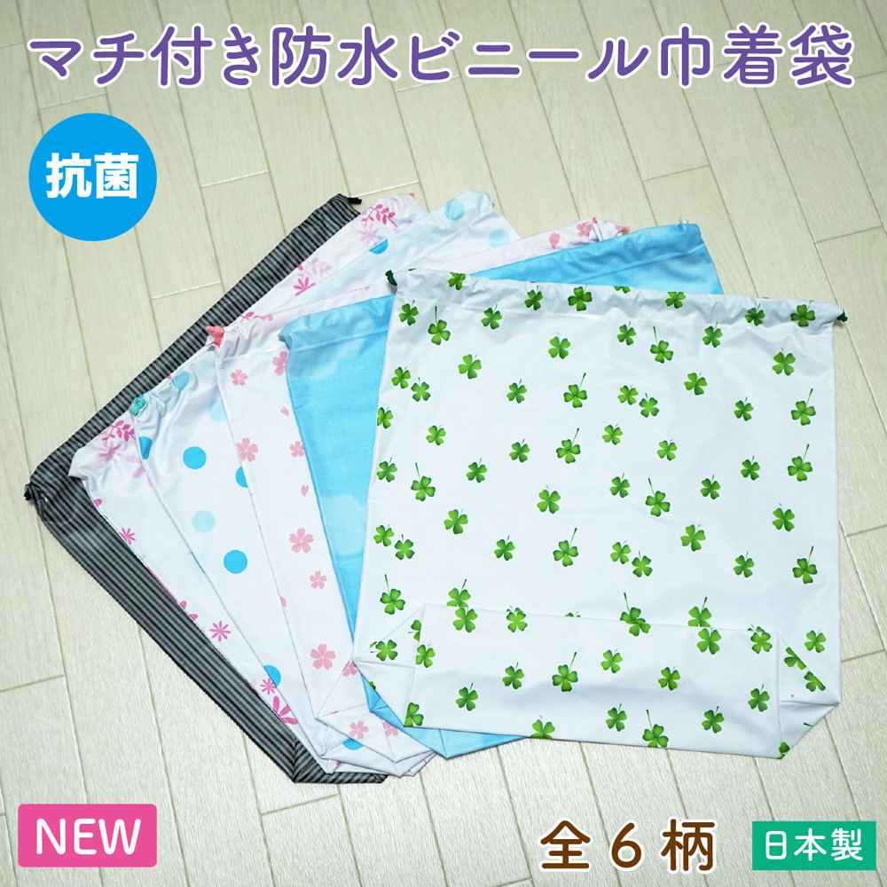 【メール便OK】NEW 抗菌 マチ付き 防水 ビニール 巾着袋 全6柄 防カビ【日本製】(約)縦39×横39cm ※メール便は1梱包にて5個までOK!温泉 スパ スポーツジム