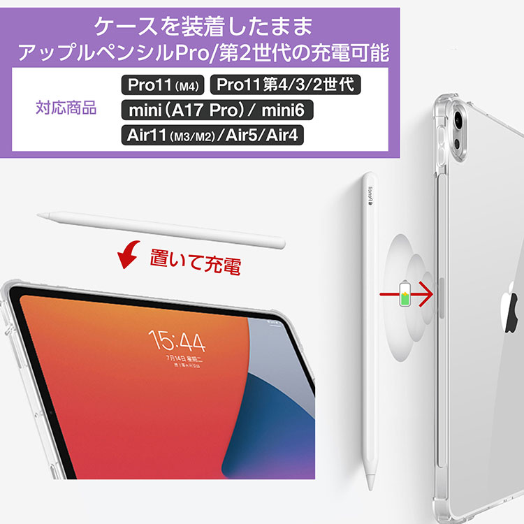 | 仕様 | 【材質】 ・フロントカバー表:PUレザー ・透明マット加工バックケース:アクリル(ハード部分)+ソフトTPU(サイドエッジ部分) 【ケースサイズと重量】 ●iPad (A16) 第11世代/iPad 10.9 第10世代 ・サイズ:(約)縦25.6×横19.3×厚1.8cm ・重量:(約)265g ●iPad 10.2 第9/第8/第7世代 ・サイズ:(約)縦26.0×横19.0×厚1.8cm ・重量:(約)265g ●iPad Pro 11インチ (M4) ・サイズ:(約)縦25.8×横19.5×厚1.8cm ・重量:(約)252g ●iPad Pro 11インチ 第4/第3/第2世代 ・サイズ:(約)縦25.6×横19.3×厚1.8cm ・重量:(約)249g ●iPad air 11(M3/M2)/iPad air 第5/第4世代 ・サイズ:(約)縦25.6×横19.3×厚1.8cm ・重量:(約)258g ●iPad mini (A17 Pro)/mini 6 ・サイズ:(約)縦20.4×横15.0×厚1.8cm ・重量:(約)163g 【機能】 ・オートスリープ機能 ・Apple Pencil収納付き ・ケースをつけたままApple Pencil(第2世代、Pro)ワイヤレス充電対応(ワイヤレス充電対応機種に限る) |