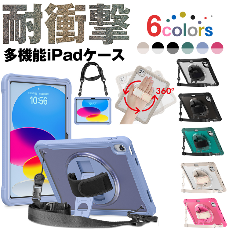 | 特徴 | ※商品説明画像中のアップルペンシルは、付属されておりません。 ■背面は半透明ケースだから自分好みにカスタマイズ可能! ■ストラップ・ショルダー付きでビジネスからプライベートまで大活躍のアイパッドケース。 ※iPadケース側へはワンタッチクリップでストラップの取り付けが可能。 ※ストラップ長さ調整可能な範囲: (約)0.6〜1.2m ※プレゼン/検針/棚卸/各種イベント/車載用などの業務端末用や散策などなどアイパッドをご活用の皆様に大好評!! ■360°回転式ハンドホルダー(手持ちバンド)付き! ※片手のみでiPadをしっかりと持つことができるので、とても使い勝手が良い! ※マジックテープで手の大きさに合わせたサイズ調節が可能。 ■【衝撃吸収層(TPU)とハードPC保護層】衝撃や落下による破損から大切な本体を守る! ■豊富なカラー全6色 ■縦横自由な360°回転式スタンド機能付きで幅広い用度に対応OK! ※持ち手部分は360度回転式の円盤型の構造になっており、8段階の回転角度調整が可能。使うシーンに合わせて自由にお好みの角度を選ぶことができます。 ■専用設計 ※iPadを装着したまま充電や音量調整、カメラ撮影、イヤホン接続など全ての操作が可能です。 |