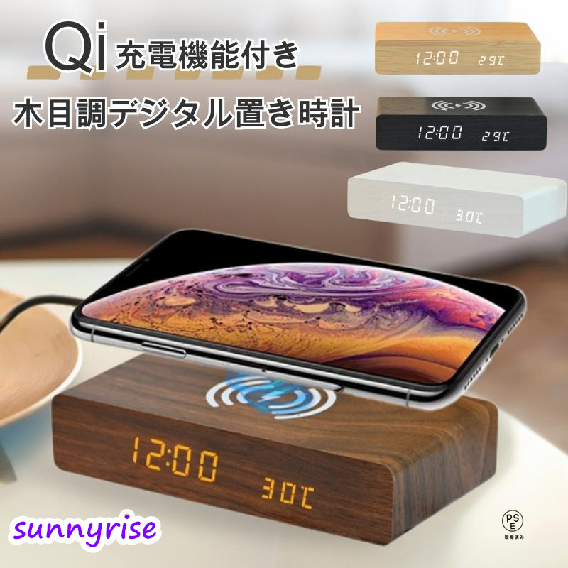 目覚まし時計 デジタル時計 Qi充電 ワイヤレス充電 置き時計 アラーム おしゃれ 北欧 木目調 LED 時刻 日付 温度 省エネ カラー ダークブラウン