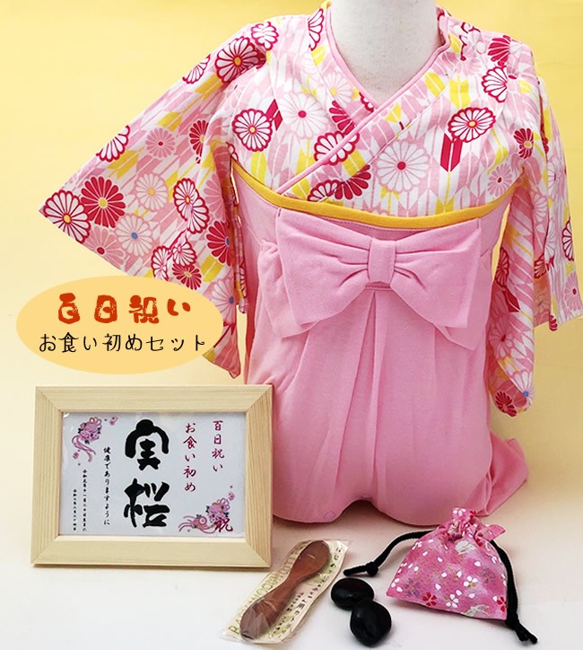 お食い初め石と衣装女の子5点セット・袴ロンパース・名入れプレート