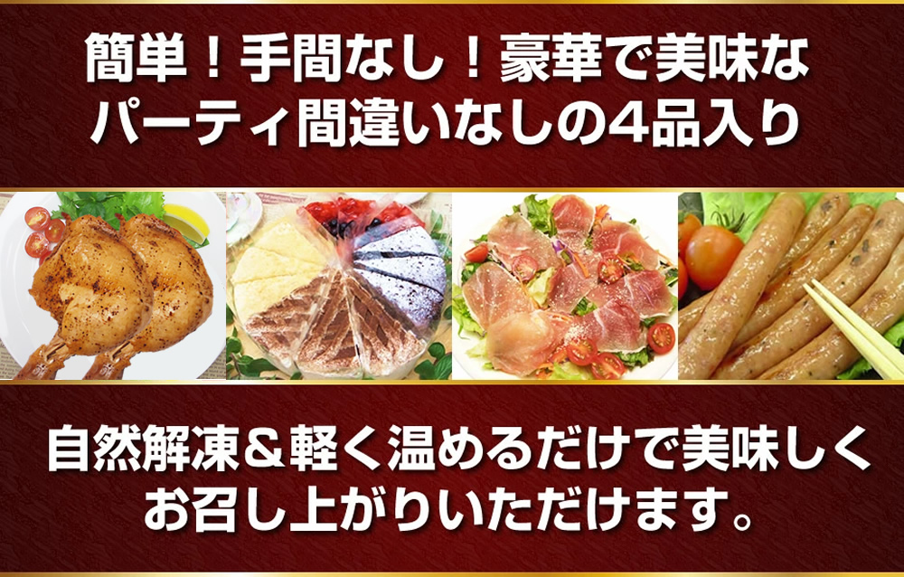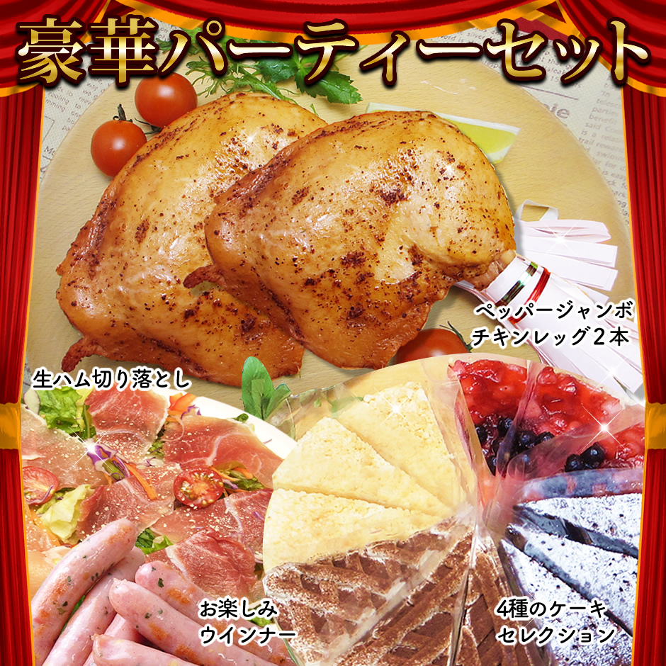 パーティーセット 送料無料 ペッパージャンボチキンレッグ 骨付き 2本 4種のケーキセレクション 生ハム ウィンナー 全4品 爆買