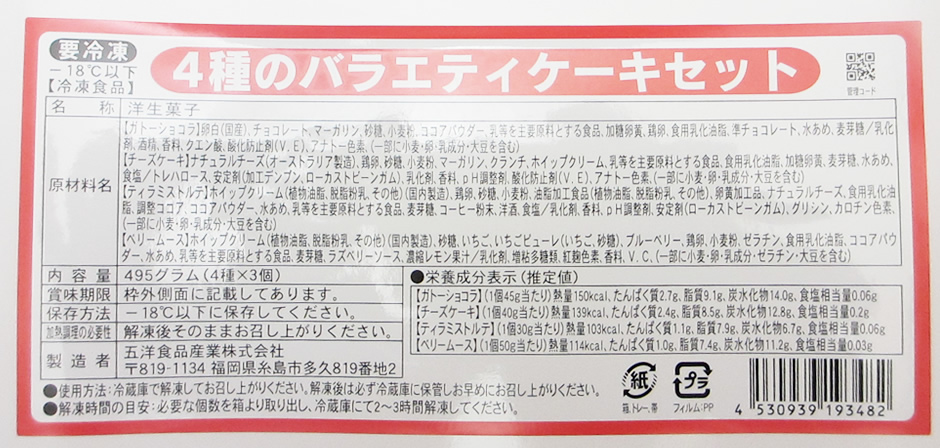 内容量:12個495g(4種×3個)・ガトーショコラ・チーズケーキ・ティラミストルテ・ベリームース/ホール時の直径18cm