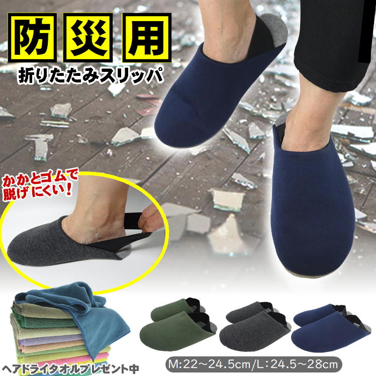 防災グッズ セット 中身 1人用 防災 スリッパ ルームシューズ かかと付き 滑り止め 洗える 避難 ケガ防止 中敷き 安全 靴 携帯 地震対策 髪専用 タオル おまけ付