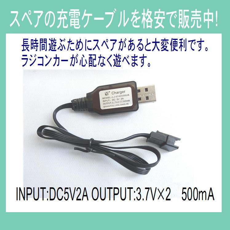 充電ケーブル USB 充電 コード ケーブル スペア 予備 替え INPUT:DC5V OUTPUT:3.7V×2=7.4V・500mA ラジコンカー おもちゃ
