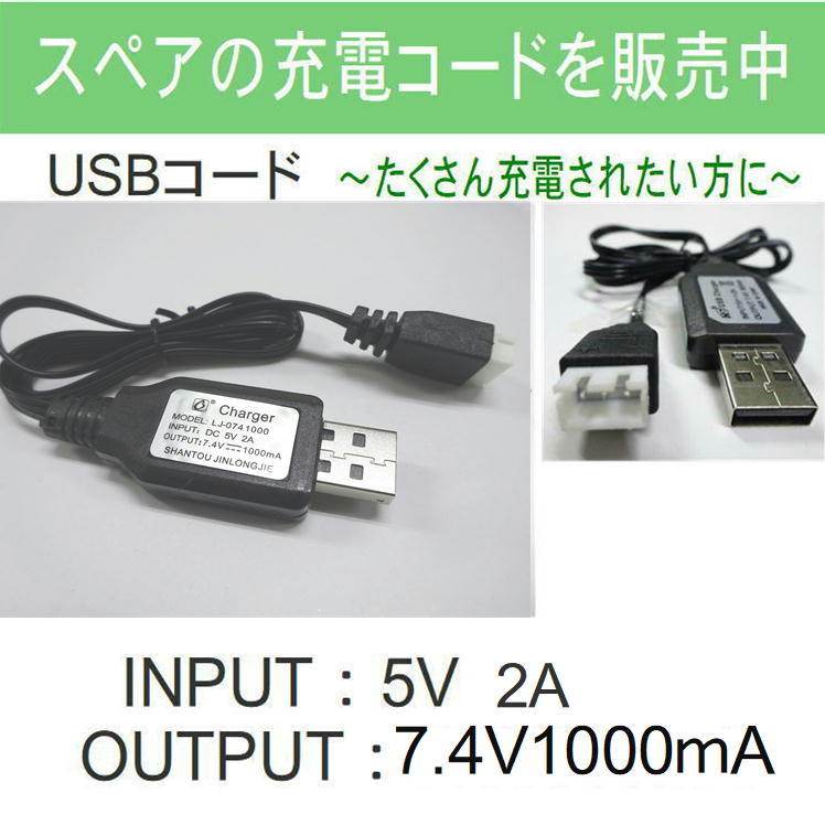 充電ケーブル USB 充電 コード ケーブル スペア 予備 替え DC5V2A OUTPUT 7.4V1000mA ラジコンカー おもちゃ