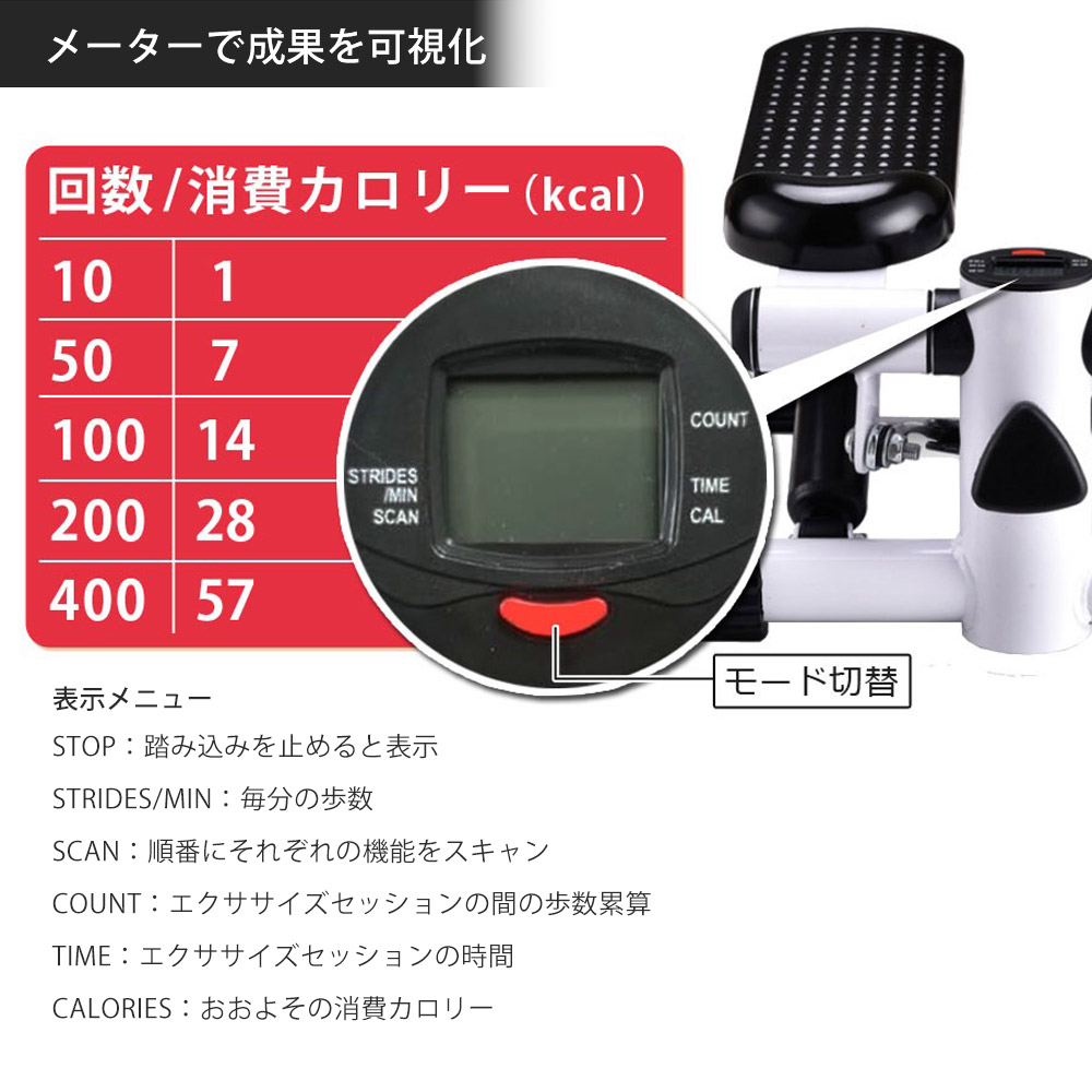 左右のフットプレートを交互に踏むステップ運動。 天候に左右されず、毎日継続して有酸素運動を行う事ができます。オイルシリンダーによる滑らかな可動はランニングなど通常の有酸素運動に比べ、着地による関節への負荷も少ないため、リハビリにも最適です。