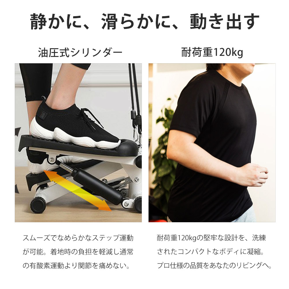 油圧式シリンダーの可動によりスムーズで滑らかなステップ運動が可能。着地時の負荷が少ないため、通常の有酸素運動よりも関節を傷めずに少ない負荷でトレーニングを行う事ができます。