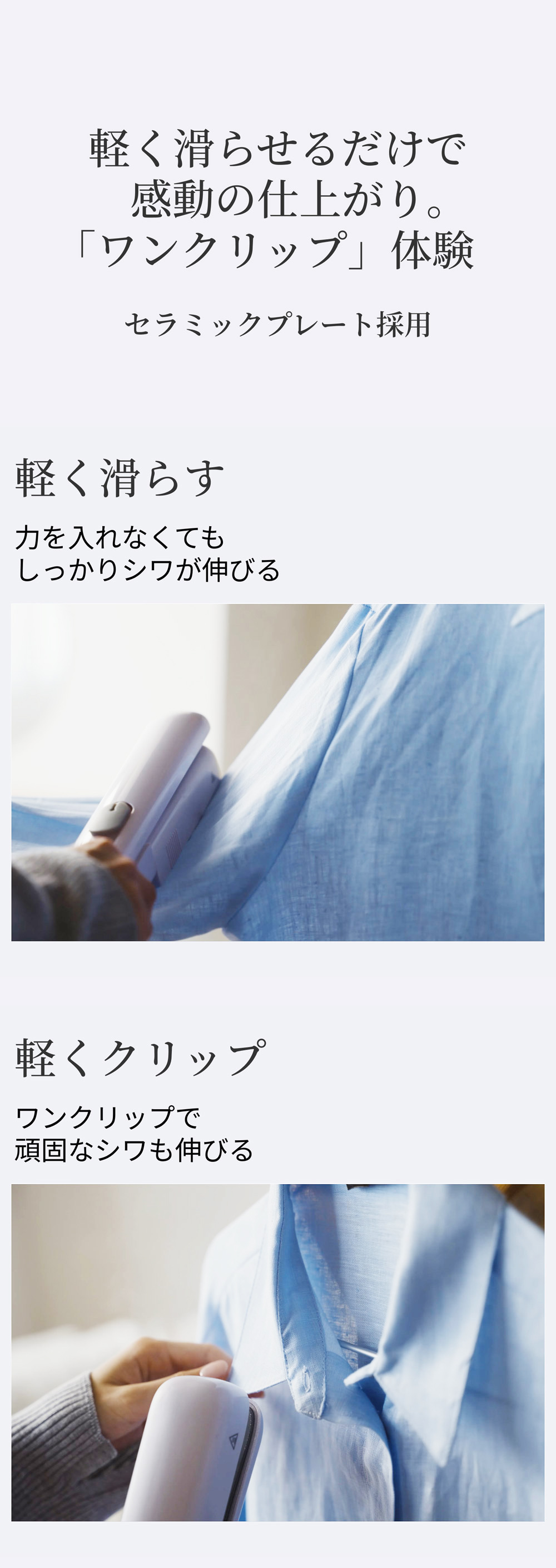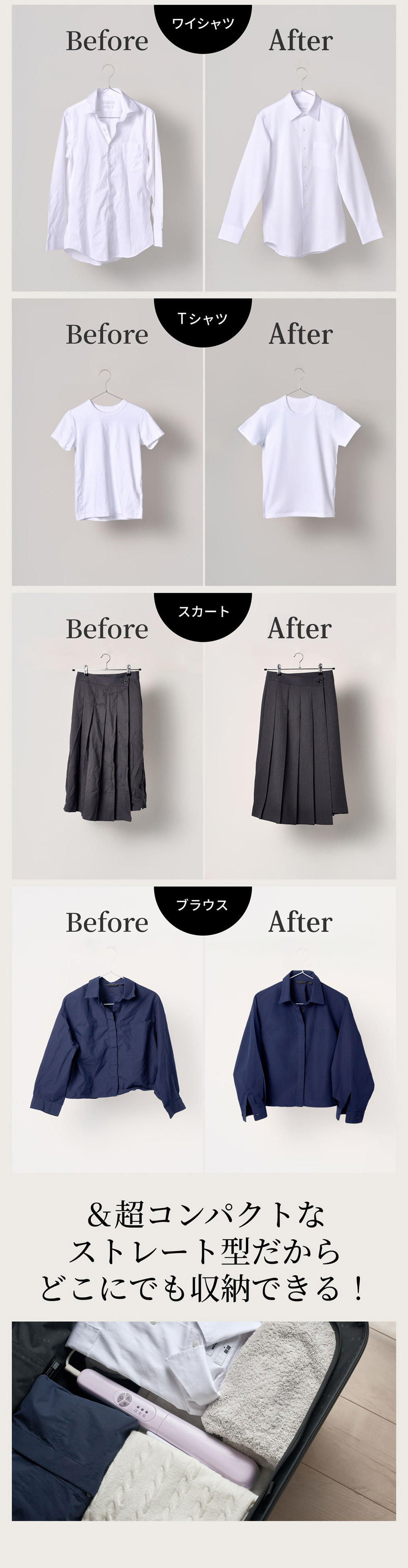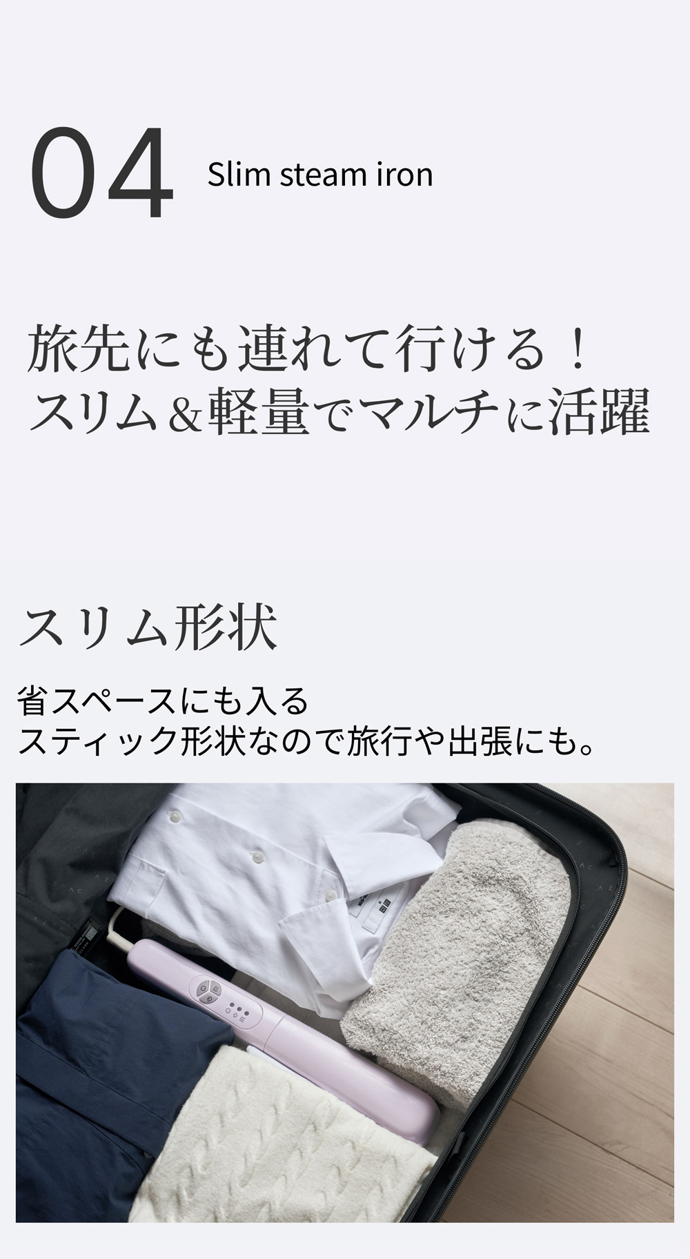 軽量&コンパクトだから、旅先でもプロ級仕上げのシワ伸ばし。