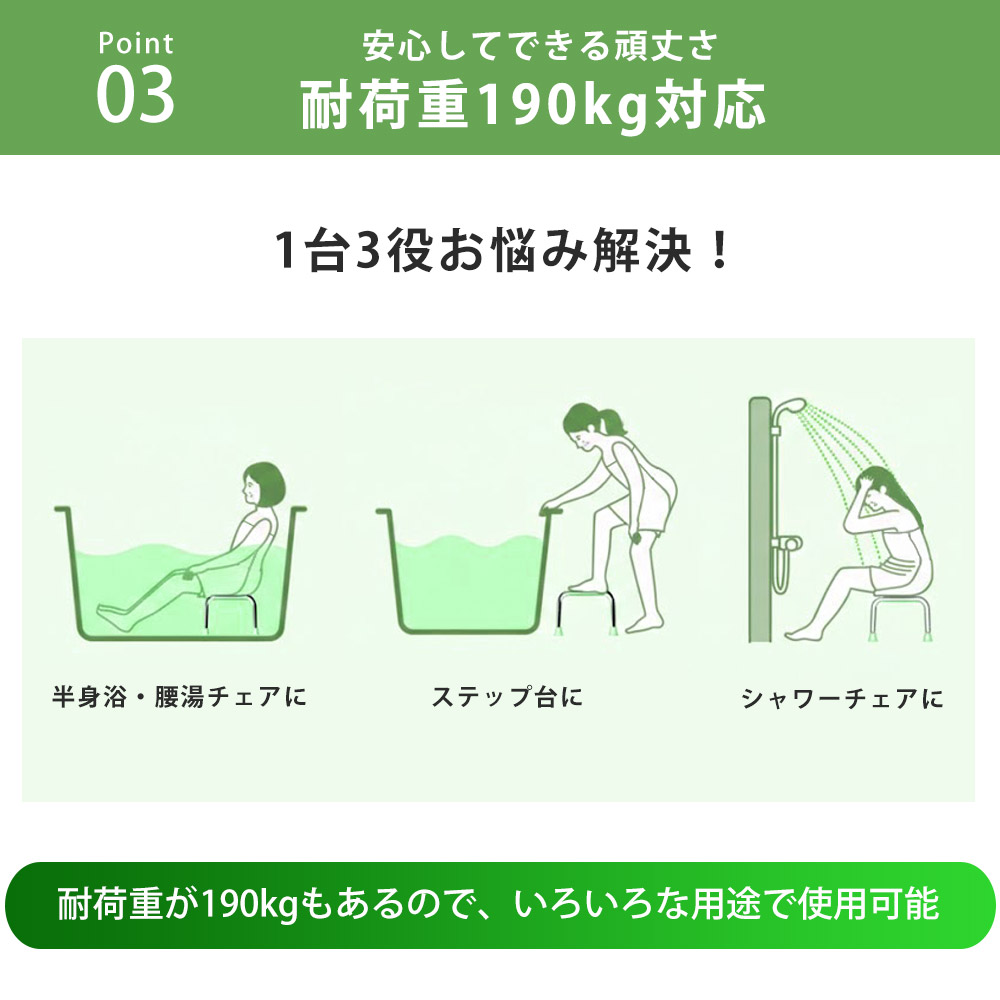 仕様 | サイズ(約) | 幅445×奥行305×高さ165mm | | 重量(約) | 1.6kg | | 耐荷重 | 190kg | | 素材 | ステンレス、ポリプロピレン | | オススメ用途 | 入浴サポート 介護 リハビリ 育児 補助 サポート 立ち座り 半身浴 普段使い ベンチ 座椅子 イス ステップ 浴槽ステップ 自宅 施設 病院 ひとり暮らし | |
