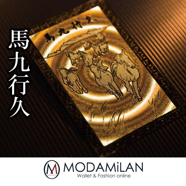 金属製で金色のカードに馬が9頭の絵柄が施されている、馬九行久(上手くいく)開運カードです。