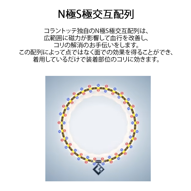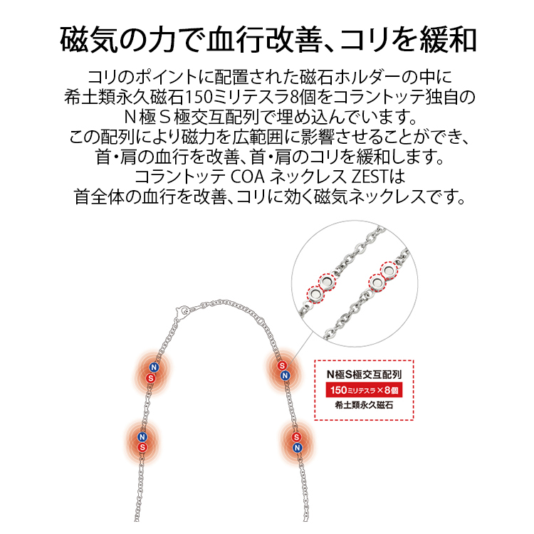 ファッションの一部としてさりげなく着用するだけで首・肩のコリケアができるチェーンタイプの磁気ネックレス。