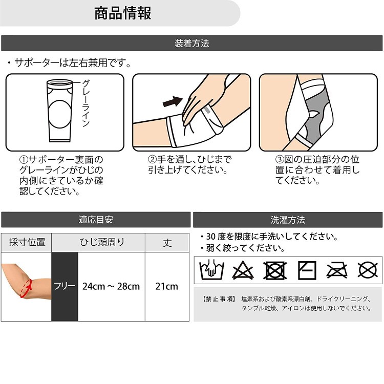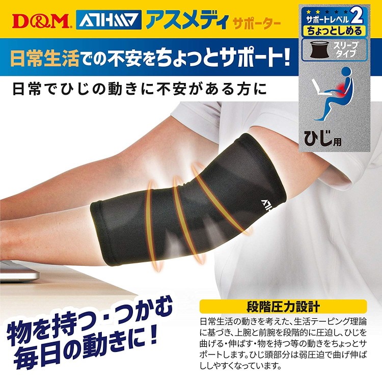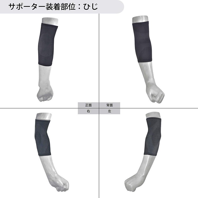 | 段階着圧サポーターひじ用(日常用/薄手) ●生活テーピング理論に基づき、ひじを強弱のある圧迫で動きをサポート。 ●薄手の生地でムレにくい。 ●サラッとして優しい着け心地。 ●繰り返しの着用も耐える強い生地。 ●日常でのひじの動きをサポート。 ちょっとしめるサポーター ひじ スリーブタイプの特徴 日常生活の身体のトラブルには、体力低下や、使い過ぎ等によるものがほとんどです。 「ちょっとしめる」サポーターは、身体の不安感をちょっとサポートし日常生活を快適にサポートします。 日常生活の動きを考えた、生活テーピング理論に基づき、上腕と前腕を段階的に圧迫し、ひじを曲げる・伸ばす・ものを持つ等の動きをちょっとサポートします。 ひじ頭部分は弱圧迫で曲げ伸ばししやすくなっています。 サポーターの本体生地は、柔らかくサラッとした快適な着け心地です。また、動いてもズレにくくフィットします。 サポーターは薄手の生地で、ムレにくく長時間でも快適に着用できます。 繰り返しの着用にも耐えられる耐久性のある生地を使用していますので、長くお使いいただけます。 こんな人にオススメ! ・物を持つ、つかむ、持ち上げるなど、ひじの日常の動作に不安のある時にご使用ください。 ・季節の変わり目などで、ひじの動きに不安のある方はお試しください。 |