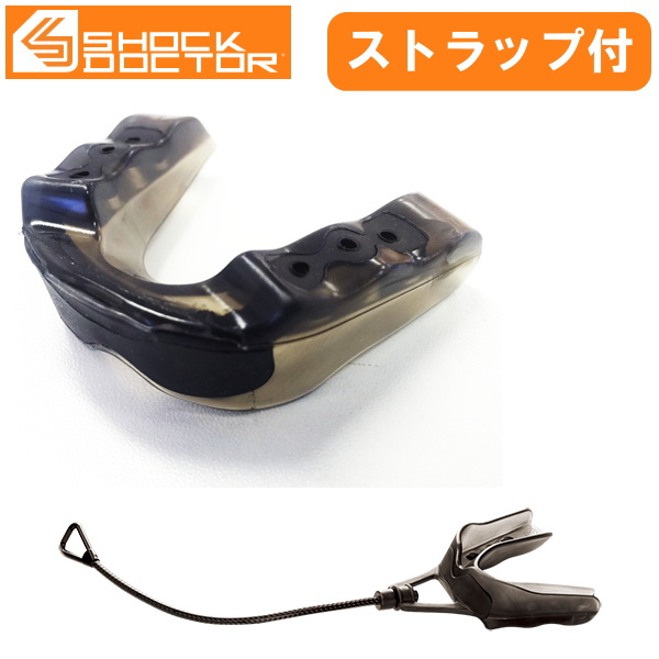 手軽に熱成形が可能なカスタムメイド マウスガードのベーシックモデル 簡単に着脱可能なストラップ付き。 フェイスマスクに取付可能。ヘルメットを着用する競技に。 |