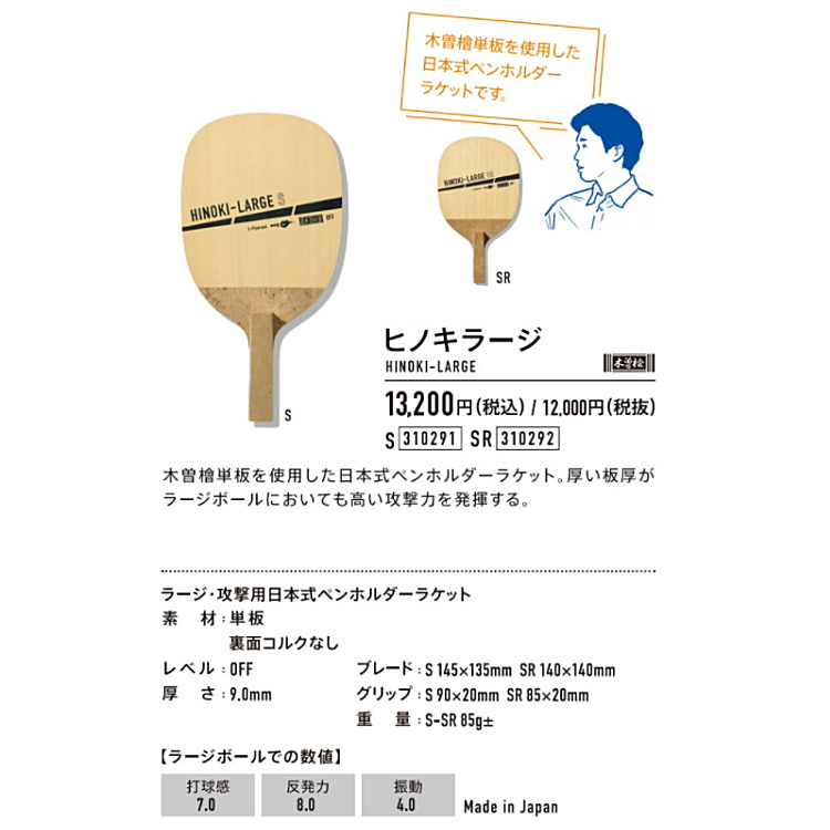 卓球ラケット ラージボール用 VICTAS PLAY ヴィクタス HINOKI-LARGE ヒノキラージ S(角型) 日本式ペン 310291