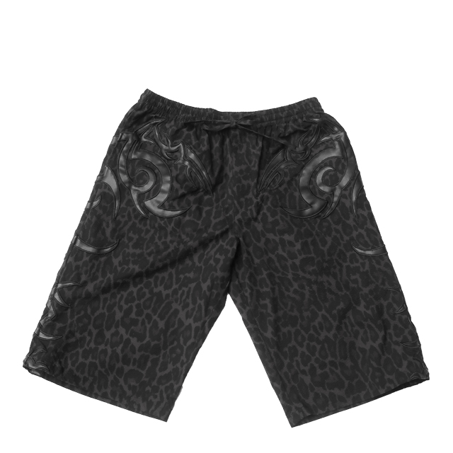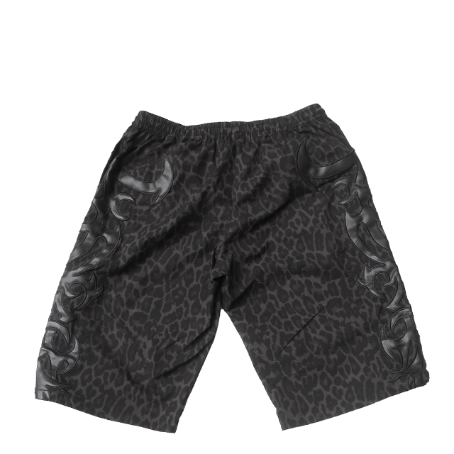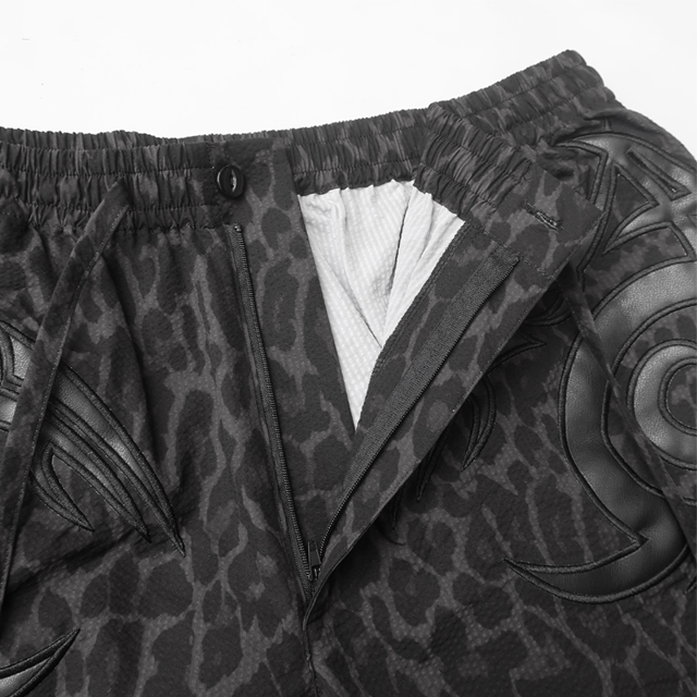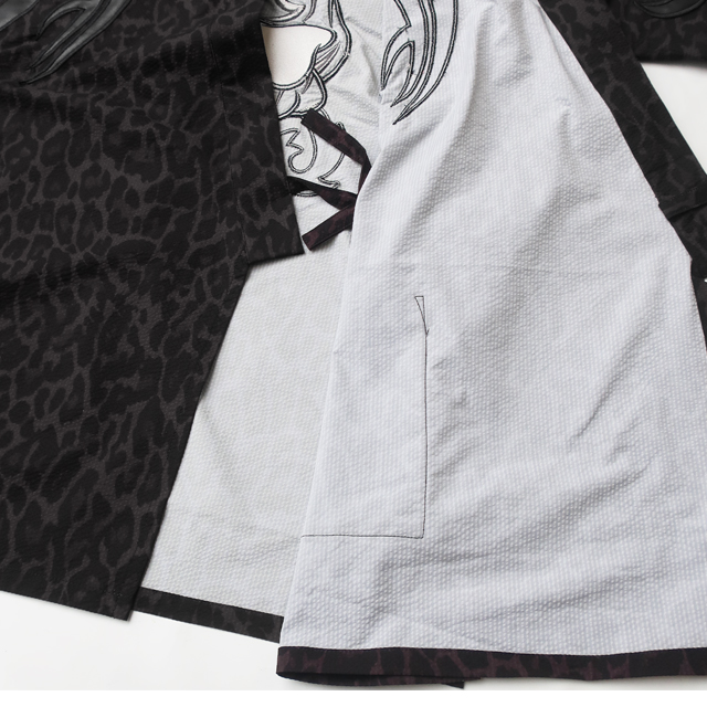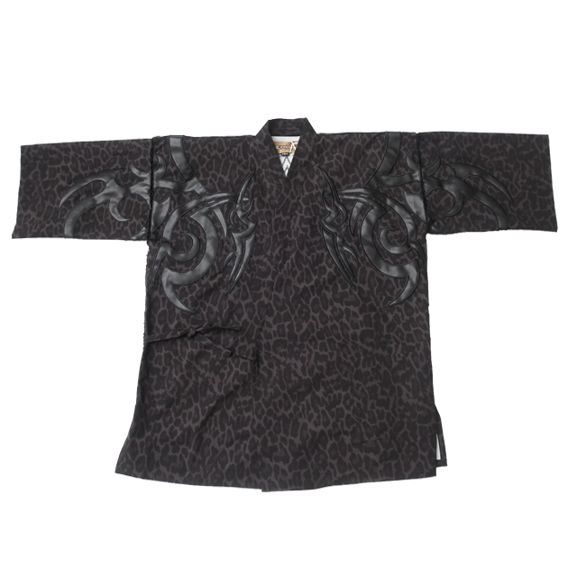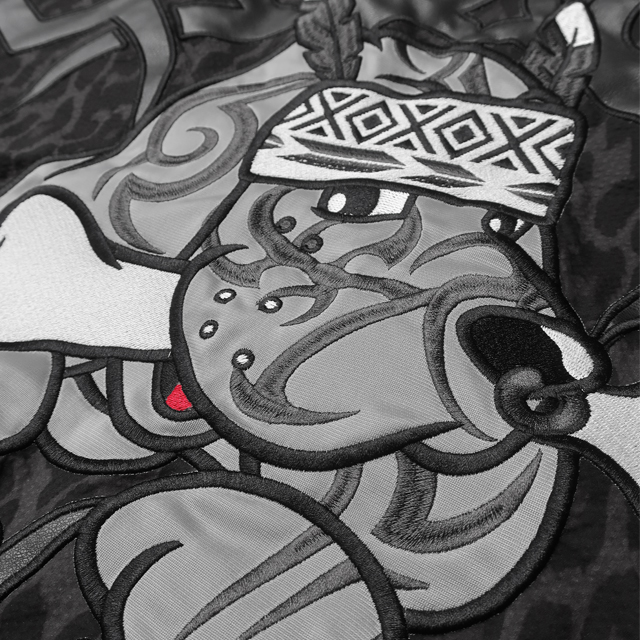 素材は、ポリエステル100%のサラッとしたフェイクちりめん素材を使用し、豹柄生地に先住民風アップリケ刺繍、ロゴは合皮でアレンジした格好良いアップリケ刺繍のデザイン。