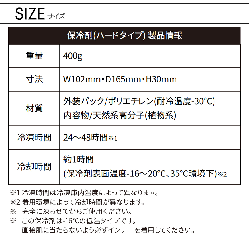 冷却時間:約1時間(保冷剤表面温度-16〜20℃、35℃環境下)※着用環境によって冷却時間が異なります