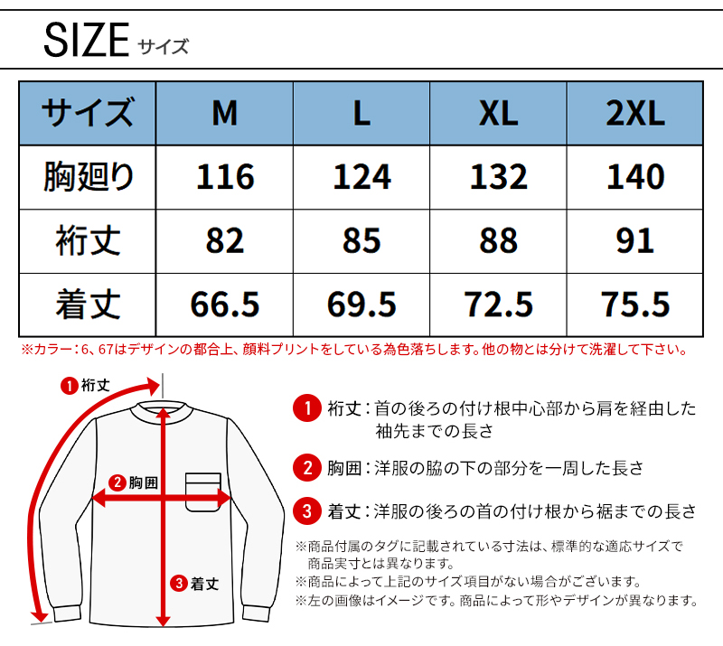 6・67カラーはデザインの都合上、顔料プリントをしている為色落ちします。他の物とは分けて洗濯して下さい。