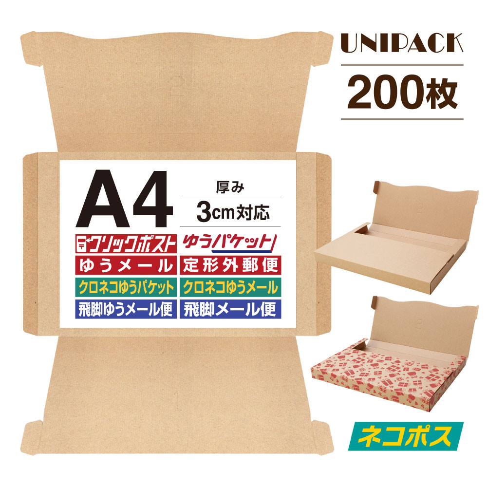 【200枚セット】[A4]ネコポス最大 フリマ・オークション用 箱 段ボール 3cm対応 最大サイズ コンパクト 箱 ゆうパケット メルカリ便 宅急便 60サイズ