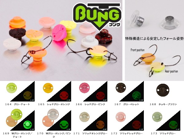 エリアゲームの最終兵器とも言えるフォーリングメソッド“縦釣り”。 この釣りに特化したTIMONフィールドスタッフの黒野浩二が開発に携わったルアーがこのBUNG(ブング)です。 このルアーは樹脂本体に金属製ウェイトを組み合わせた特徴的な構造になっており、「直径が大きく比重の軽い樹脂部分」と「直径が小さい金属ウェイト部分」とのバランスにより、フロントフックポジションでもリアフックポジションでも金属ウェイト側を確実に下にしてパラシュートが落ちるかの如くゆっくりと水平に近い姿勢で揺れずにフォールします。 採用したマテリアルは比較的比重が小さく塗装性の良い透明のABS樹脂。そして、むき出しの金属部分は万が一ラインが切れてトラウトが食べてしまっても影響が少ない様、鉛ではなく環境負荷の小さい亜鉛を採用いたしました。 形状は前後対象ですのでどちらのアイにフックを掛けて頂いてもOKです。樹脂部分の中央にはフロントフックで使用した際にフックをセンターにキープし易い様に浅めの溝をつけて有ります。 基本的な使い方は投げてフォールさせるのくりかえし。その日の状況に応じてフォール時間を長く取ったりボトムに置く時間を長く取ったりしてみて下さい。又、0.4gと0.6gの2ウェイトを準備致しましたので魚の反応に合わせてフォールスピードを調整して下さい。
